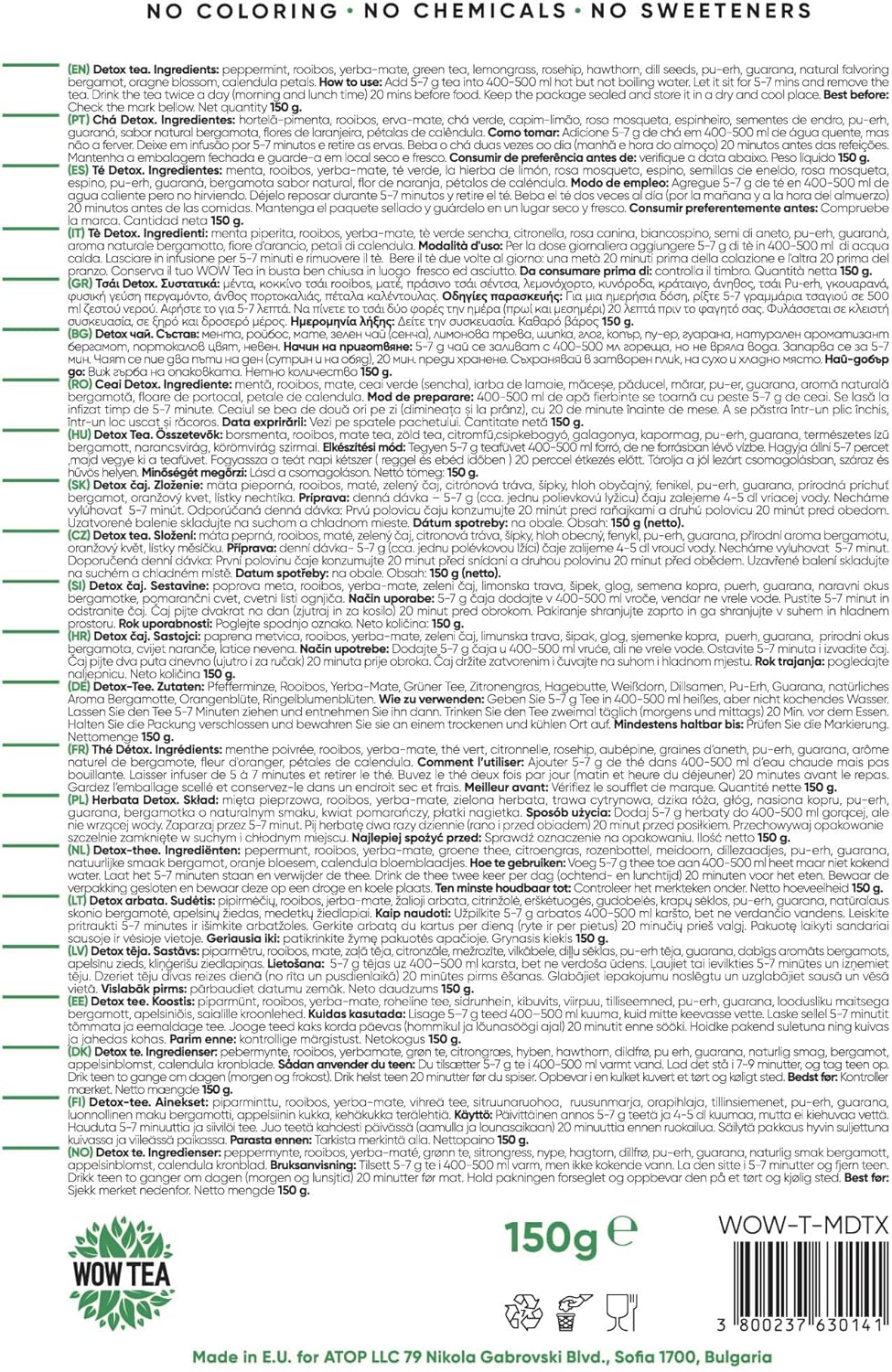 WOW TEA Mint Detox Ingredients: Peppermint, Rooibos, Yerba Mate, Green Tea, Rose Hip, Hawthorn Fruits, Fennel Seeds, Bitter Vetch, Pu-Erh, Guarana, Orange Blossom, Natural flavouring Bergamot, Calendula Petals.