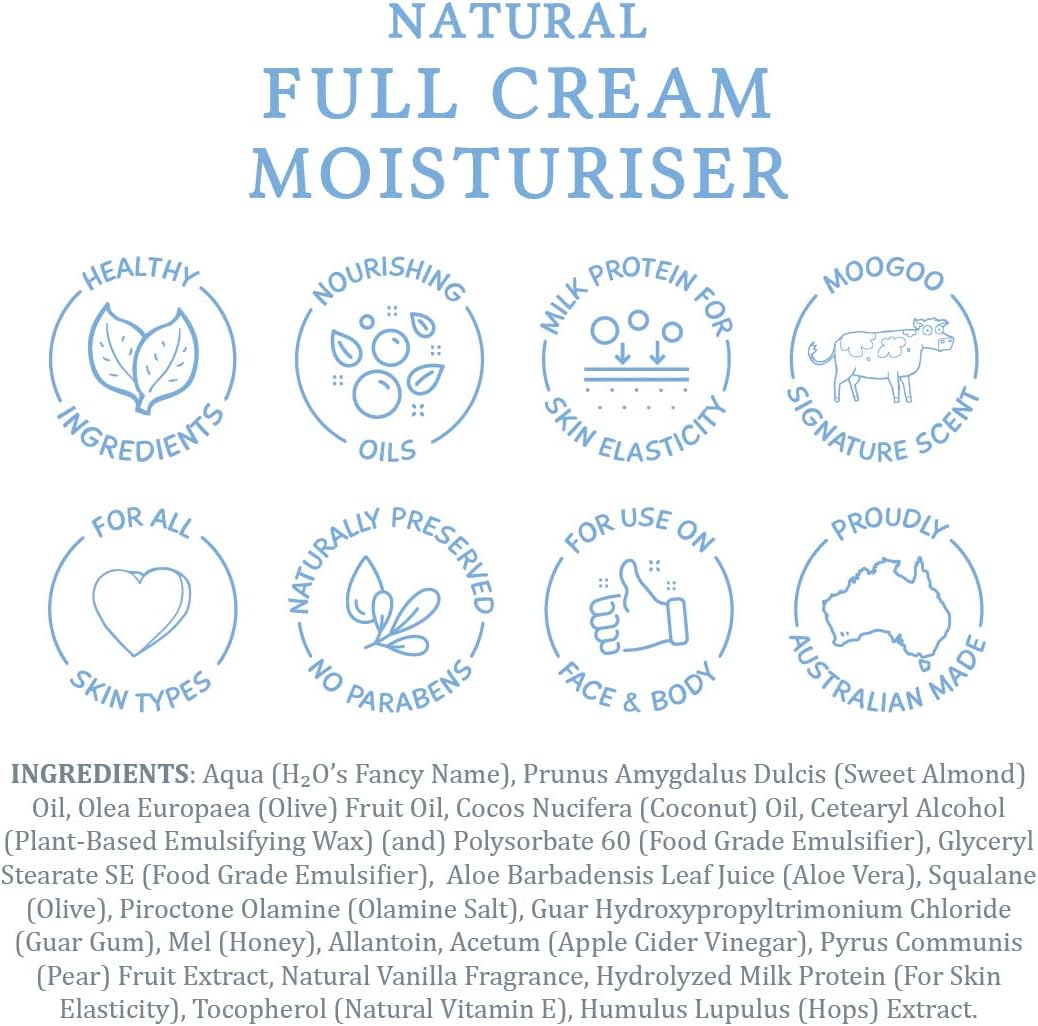 SIMPLER, HEALTHIER CONDITIONERS: MooGoo’s Natural Full Cream Moisturizer uses naturally nourishing ingredients like milk protein, sweet almond, and coconut to nourish and repair dried out, damaged, or irritated sensitive skin while hydrating the face and body.