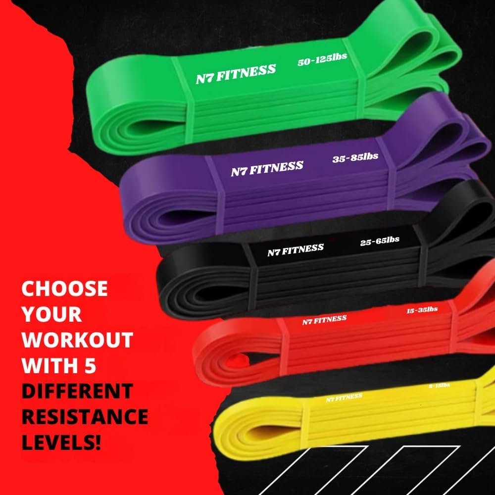 [Vary Your Workout] : Begin your resolution with the N7 Fitness Pull Up Resistance Bands. The set includes five high-quality, durable bands in a range of resistances: X-Light(8-15lbs), Light(15-35lbs), Medium(25-65lbs), Heavy(35-85lbs) and X-Heavy(50-125lbs). With such a wide variety of resistances, this set is perfect for all your training needs.
