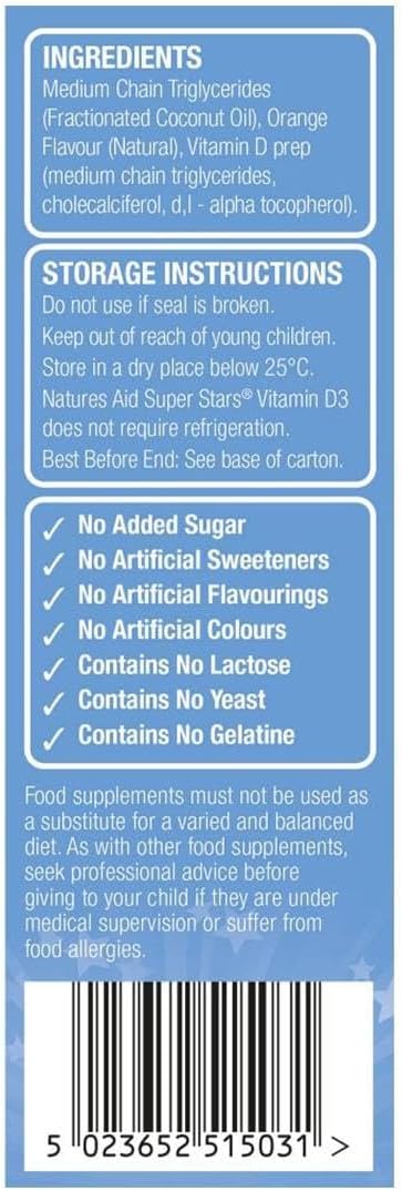 Natures Aid Super Stars Vitamin D3 Spray for children provides 400iu Vitamin D3 in two delicious orange flavoured sprays. Simply spray directly into the mouth daily for children aged 4-12. Vitamin D supports normal immune system function, and healthy bones, teeth and muscles. The product is made using a vegetarian vitamin D3, and contains no added sugar, artificial flavours, colours or preservatives.