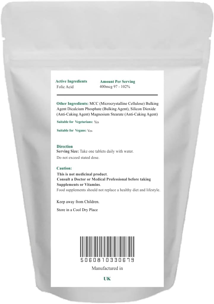 Active Ingredients: Folic Acid 400mg 97-102% INACTIVE INGREDIENTS: MCC (Microcrystalline Cellulose), (Bulking agent ) Dicalcium Phosphate (bulking agent), Silicone Dioxide (anti-caking agent) Magnesium Stearate (Anti-caking Agents)