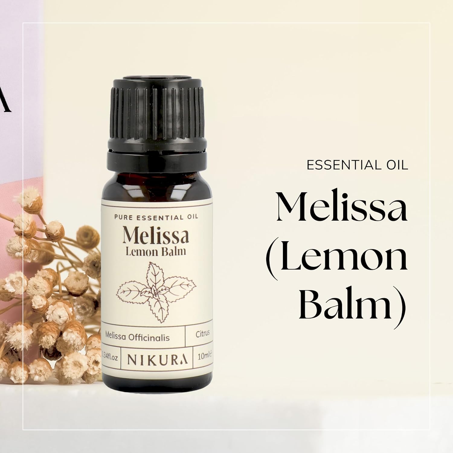 Nikura Melissa (Lemon Balm) Essential Oil – 10ml | 100% Pure Natural Oils | Perfect for Aromatherapy, Diffusers, Humidifier, Bath | Great for Self Care, Skin | Vegan & UK Made