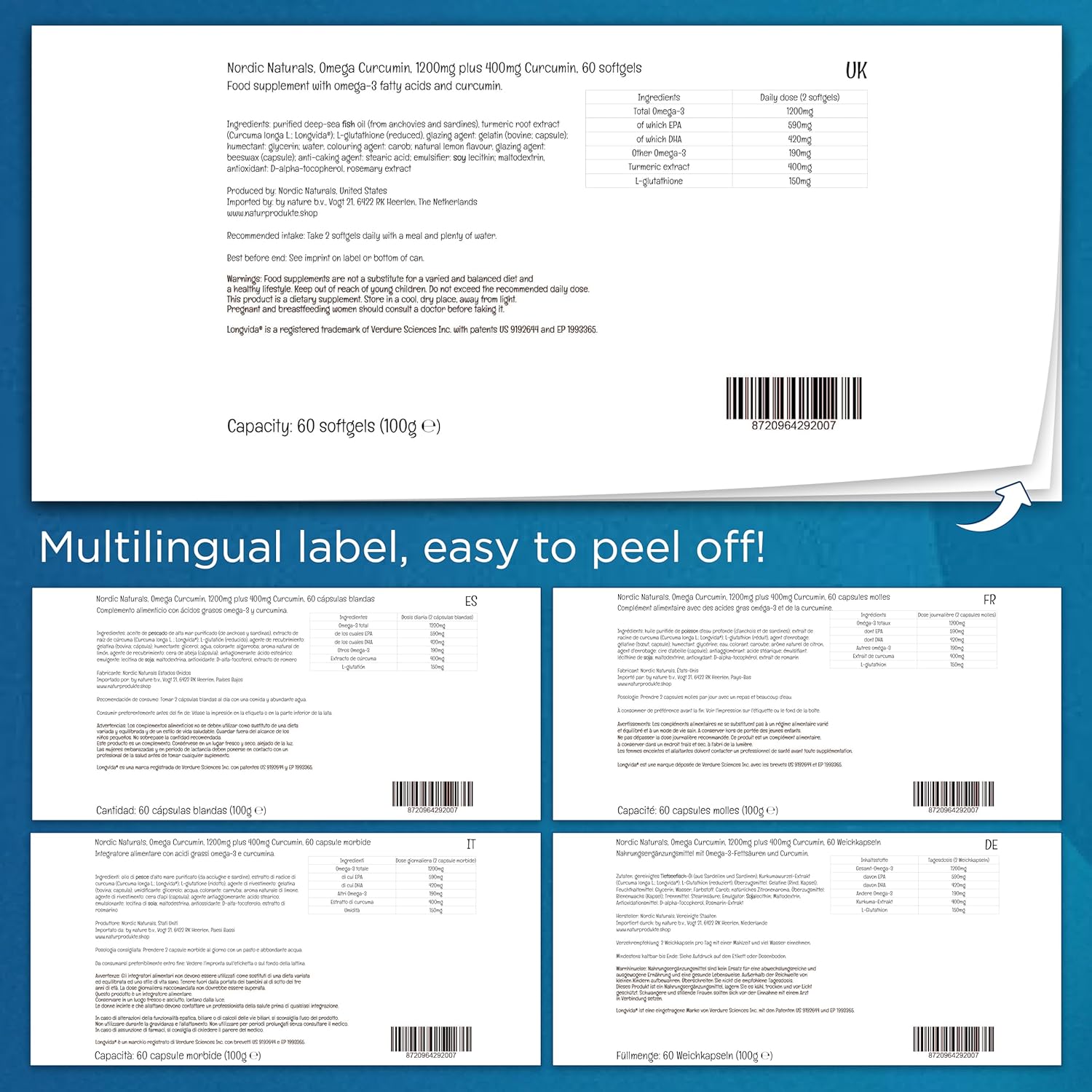 HIGH DOSAGE: One dose, 2 softgels, Omega Curcumin by Nordic Naturals contains 1200mg total omega-3, of which 590mg EPA and 420mg DHA, 190mg other omega-3, 400mg turmeric extract and 150mg L-glutathione that you put into your body every day can supply