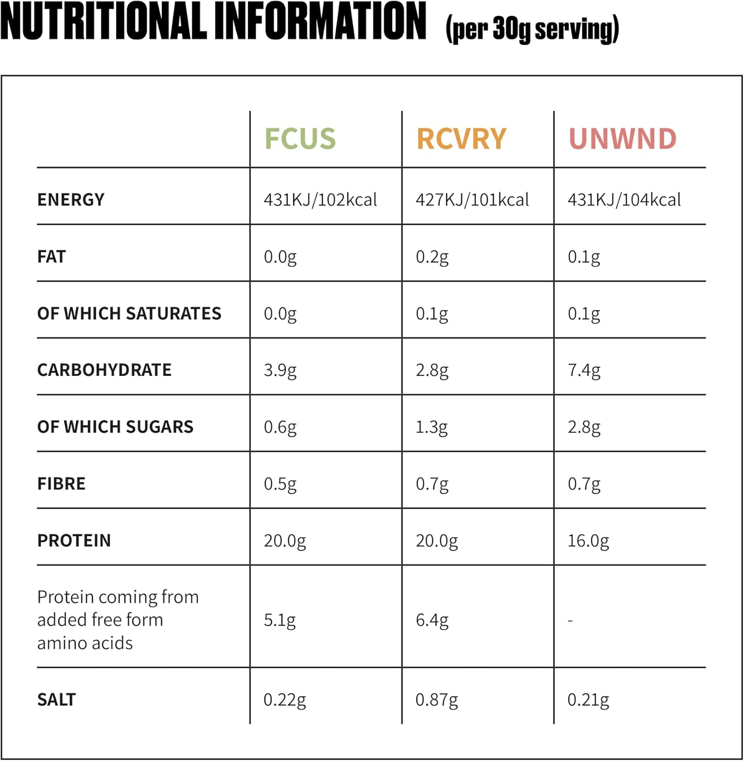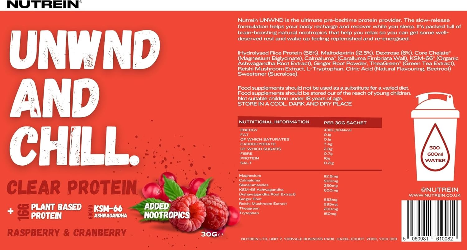 ASHWAGANDHA – The slow-release post workout, UNWND, contains ashwagandha, helping your body recharge overnight. Contains 150mg L-Tryptophan per serving. 16g clear protein per serving.
