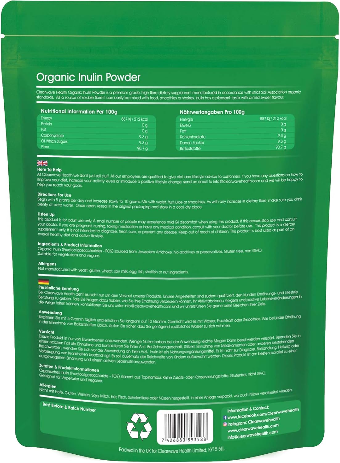 ORGANIC INULIN POWDER: Clearwave Health Organic Inulin Powder is a 100% natural prebiotic with a multitude of health giving properties, making it a great choice for those looking to add fibre to their diet. The organic inulin is certified by the Soil Association.