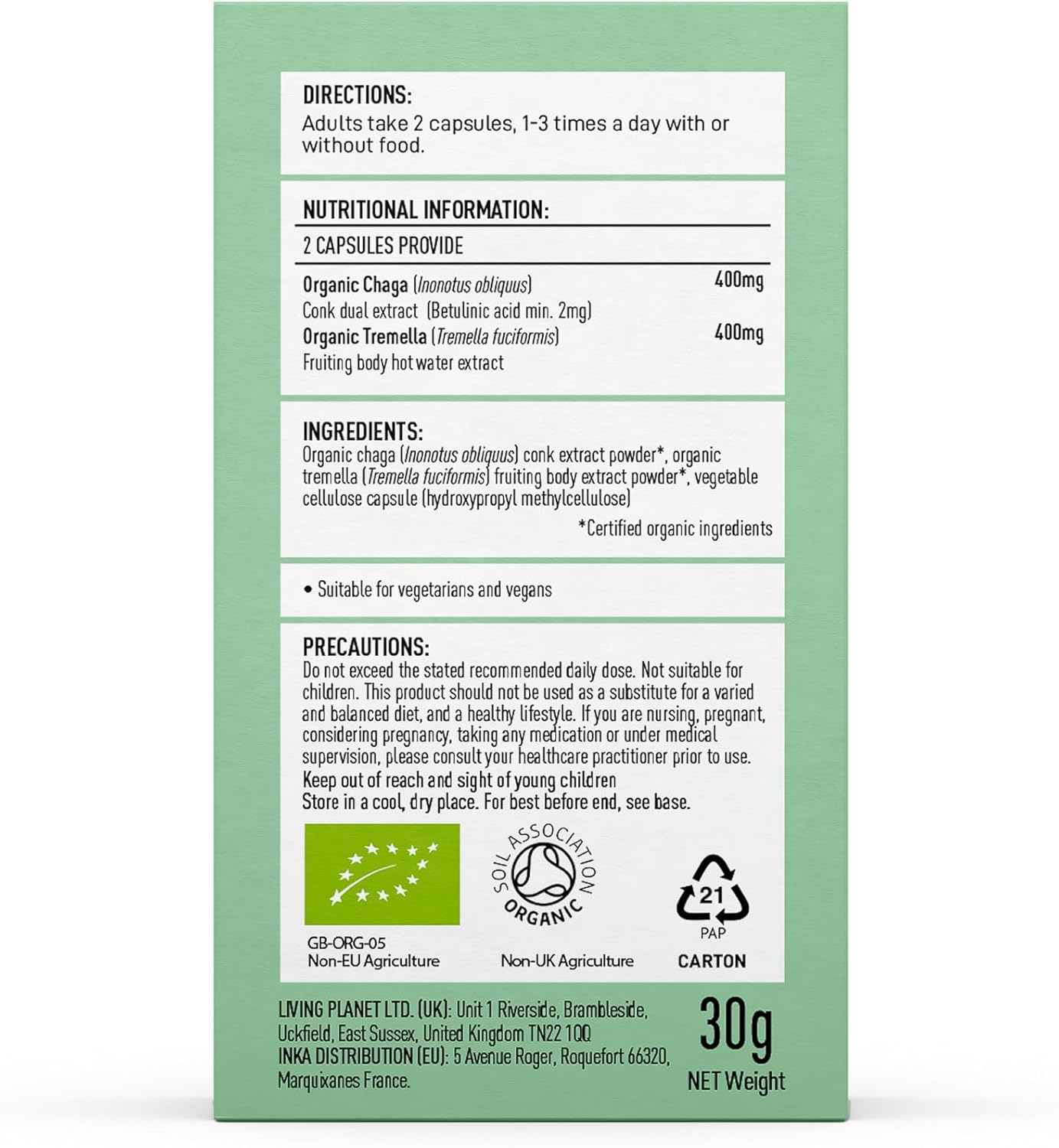 Our Organic Myco Beauty is a blend of tremella, known as the ‘beauty mushroom’ and a popular ingredient in skincare products throughout East Asia, and the distinctive chaga mushroom, rich in betulinic acid, grown and wild crafted from birch trees