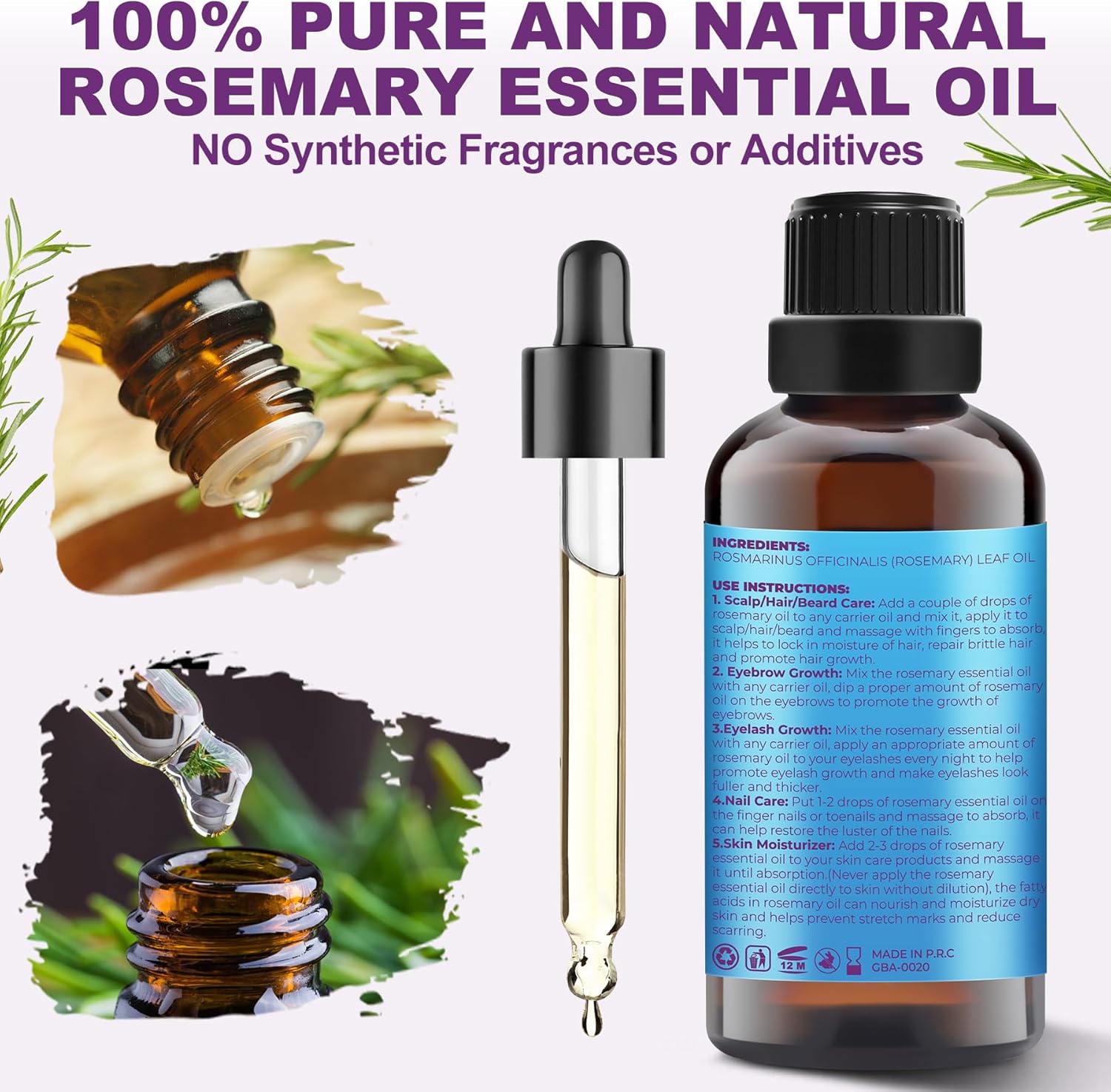 Organic Rosemary Oil for Hair Growth,100% Pure Undiluted Rosemary Essential Oil w/Hair Roller for Scalp & Skin Care,Non-Greesy Hair Growth Oil Serum Hair Loss Treatment for Women Men Eyebrow Eyelash