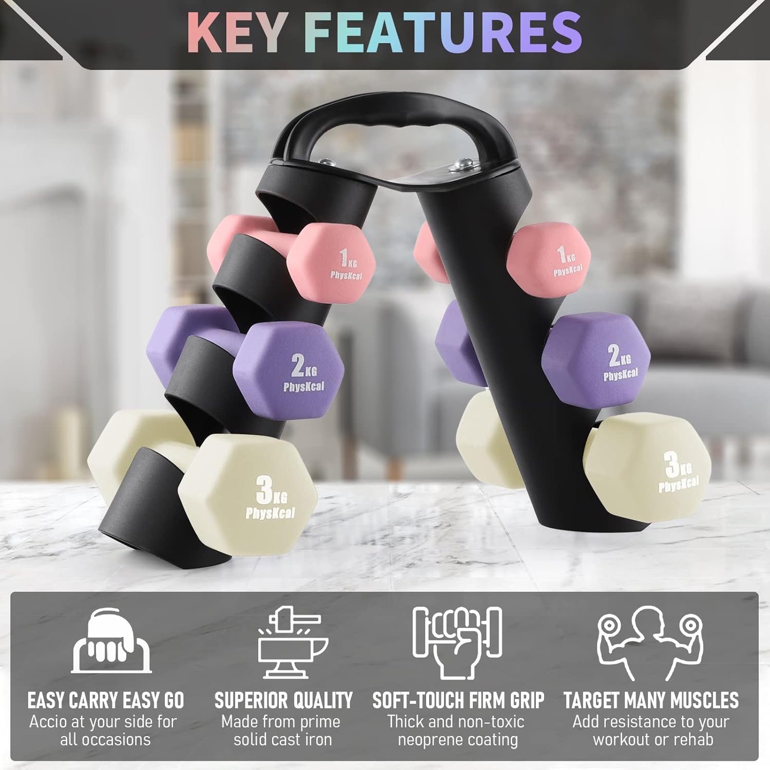 PhysKcal Dumbbells Set of 6 with Carry Rack, Hand Weights & Tree Set for Home Gym Studio Workout