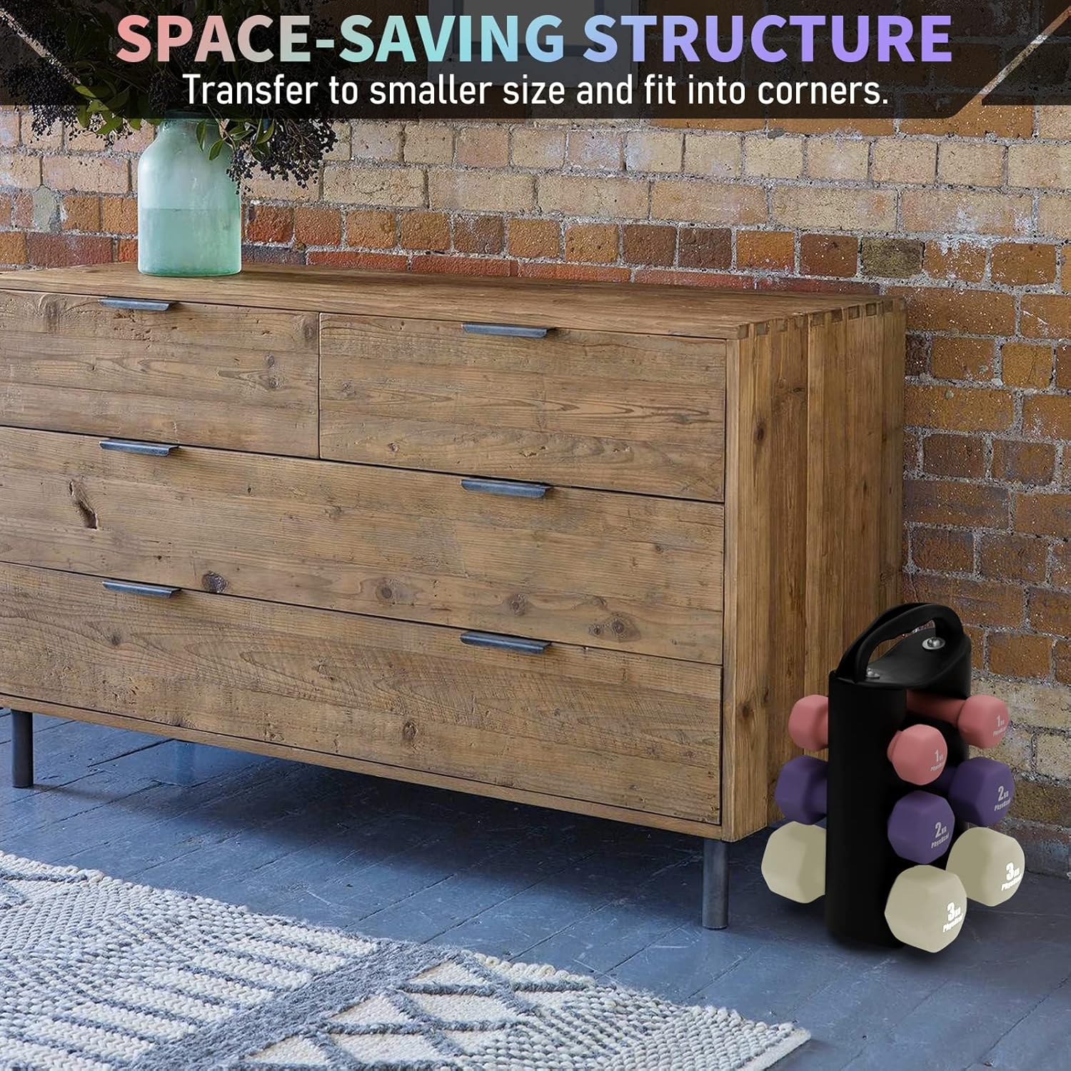 🤍【Easy Access, Store and Go】Looking for a perfect dumbbell set to start your fitness regime? This hand weight set includes a pair of 1KG, 1.5KG, and 2KG neoprene dumbbells with a rotatable and portable storage rack made from durable ABS plastic, featured with easy access and storage for all occasions. Rotate the rack frame clockwise to hide this weight set away in a narrow corner, and rotate anticlockwise for easy reach during sweat sessions.