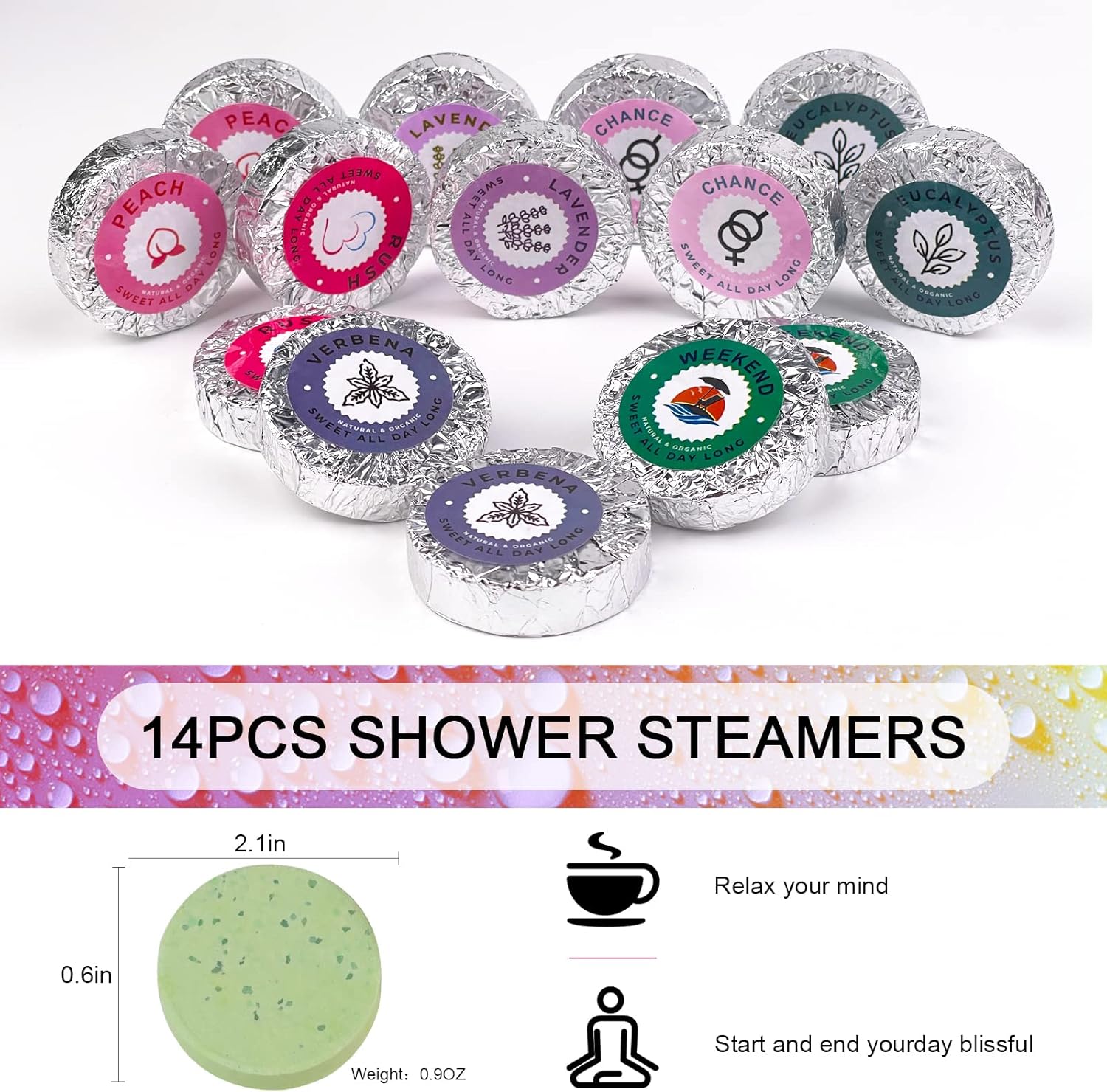14PCS Shower Steamers with 7 Scents: 2 * VERBENA 2 * PEACH 2 * EUCALYPTUS 2 * LAVENDER 2 * CHANCE 2 * RUSH 2 * WEEKEND