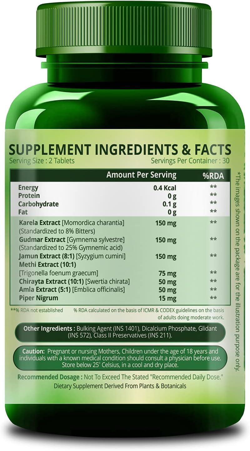 REGULATES BLOOD SUGAR: The intrinsic properties of ingredients like karela, gudmar, fenugreek & jamun are so that they are known to improve the secretion of insulin for regulating blood sugar levels. Gudmar is known to have anti-diabetic properties that manage both pre-meal and post-meal sugar levels by regulating sugar absorption. These fiber-rich fruits and extracts help in balanced insulin function.