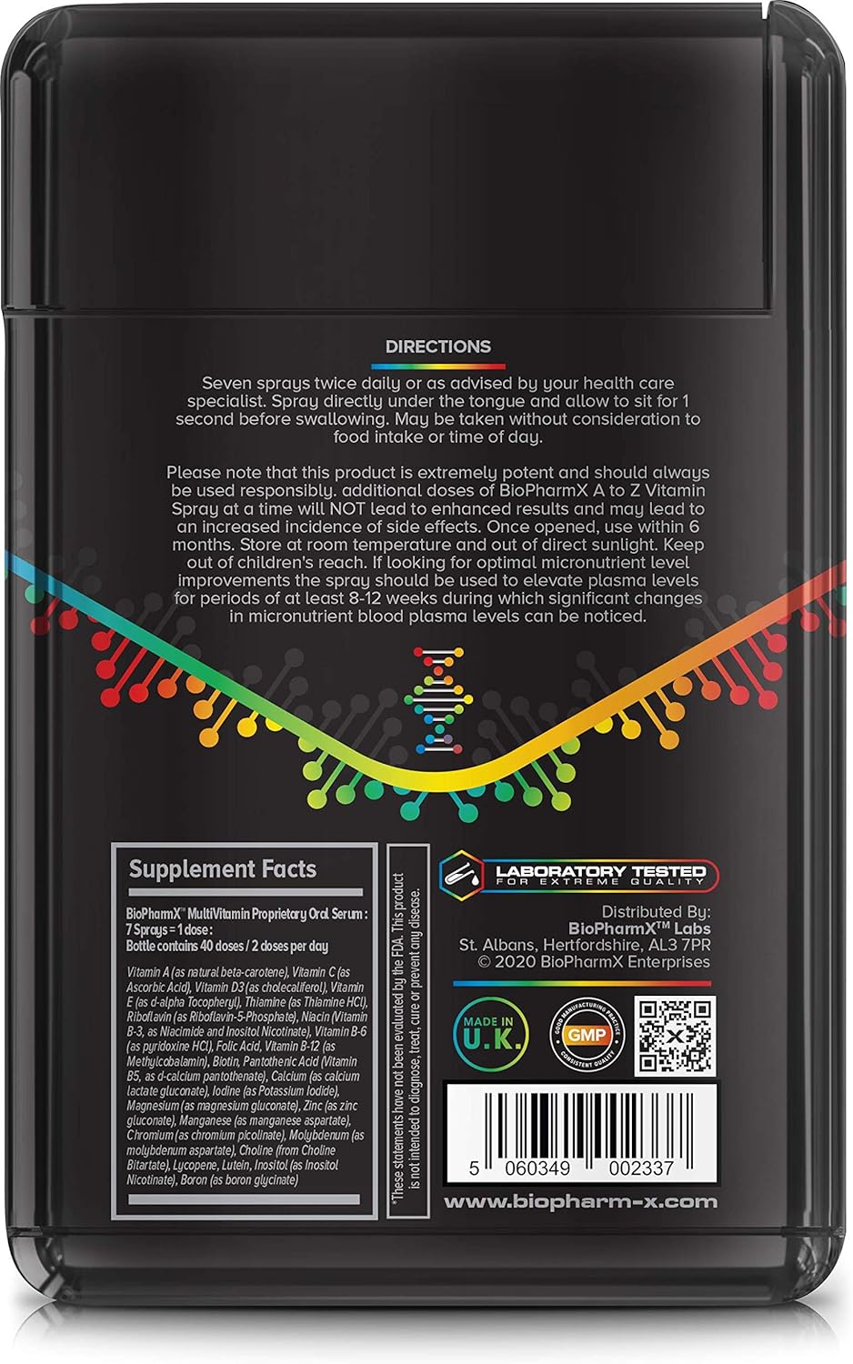 Guided by pharmacology and validated by nutritional science, every BioPharmX A to Z Multivitamin Spray is at the forefront of multidisciplinary nutritional research. Each component of our advanced formulation has been highly refined and exceeds the highest pharmaceutics purity standards. By additionally utilizing sublingual administration, the pharmaceutical strength A to Z vitamin formulation can pass directly into the bloodstream, completely bypassing gastrointestinal degradation and presytemic metabolism. Both of which greatly reduce vitamin concentrations before are able begin to orchestrate and participate in a vast array of biological processes beneficial to health and well being.