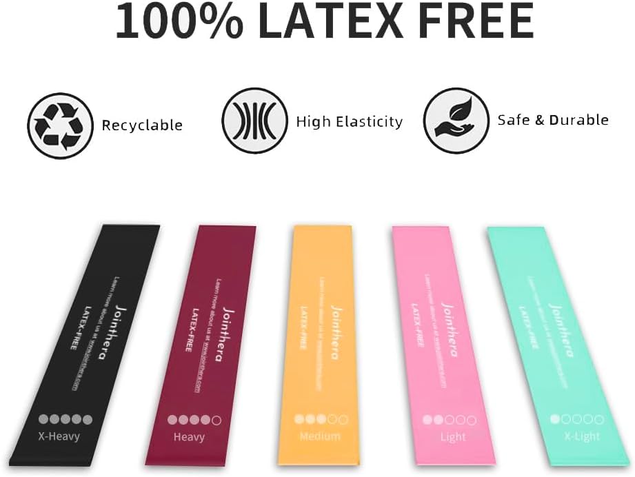 Get the most out of your workouts with the JOINTHERA Premium Latex-Free Resistance Loop Band Set. This pack of five latex-free bands is suitable for men and women of all fitness levels and is perfect for a variety of exercises, including yoga, Pilates, strength training, and physical therapy. Each band has enough strength to provide great resistance, allowing you to customize your workouts and achieve your fitness goals. Made from high-quality non-latex materials, these bands are skin-friendly, durable, and odor-free, making them perfect for indoor use. These resistance bands are also easy to clean and non-adhesive to dust and hair, ensuring they remain hygienic and long-lasting. With their compact and lightweight design, these bands are perfect for home gym and on-the-go workouts. Plus, with a free carrying bag included, you can take them anywhere you go.