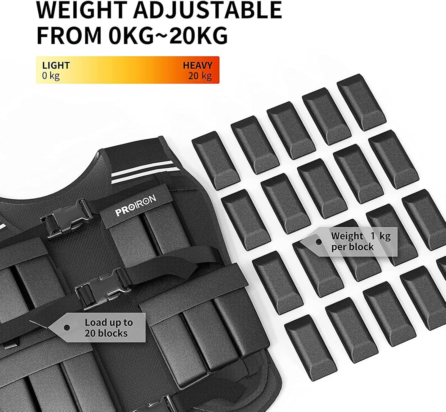 💪Freely adjustable weight. Increased adjustability compared with the traditional weighted vest. Weighted vest featuring 20 small weighted packs(each 1kg Iron sand bag) . The weight can be removed separately, allows you to pick a weight between 0kg-20kg. Suitable for beginners and experts. IMPORTANT – weighted vest are removable weighted sandbags (not weighted blocks) – please know it.