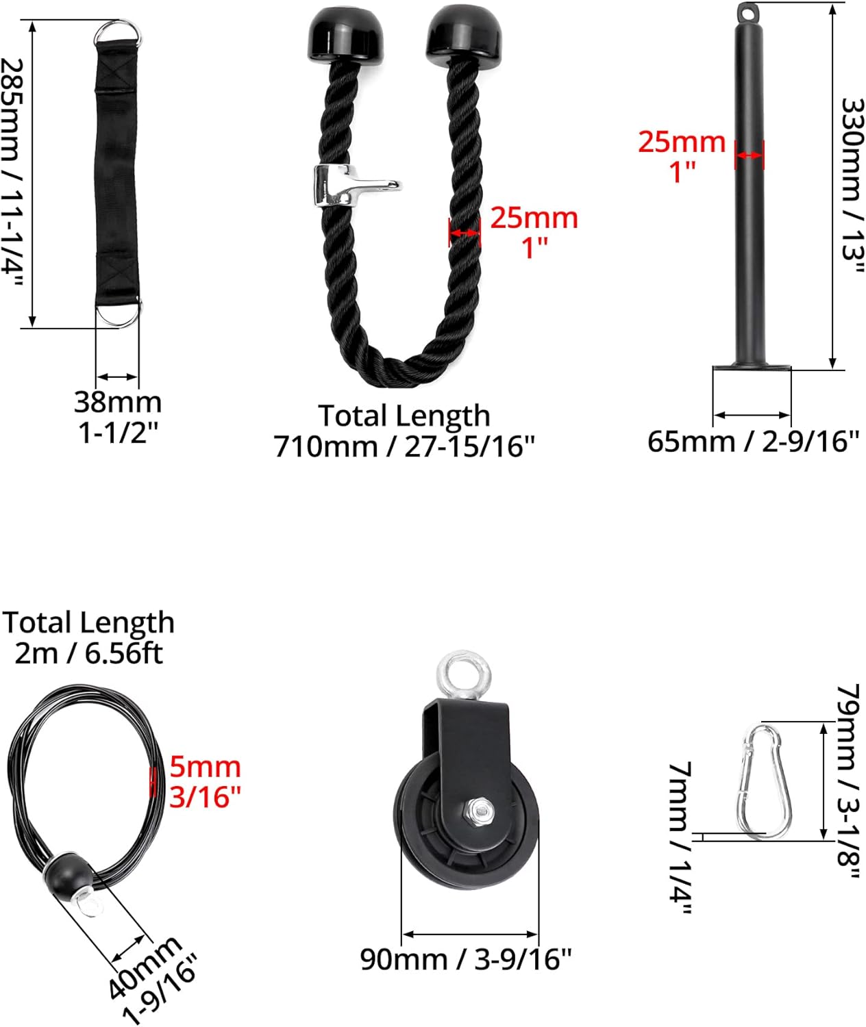 Cable pulley gym set: weight tray × 1, 2M adjustable 5mm steel wire rope × 1, double-layer safety strap × 1, plastic hanging pulley × 1, 8mm quick connection buckle × 3, nylon triceps rope × 1