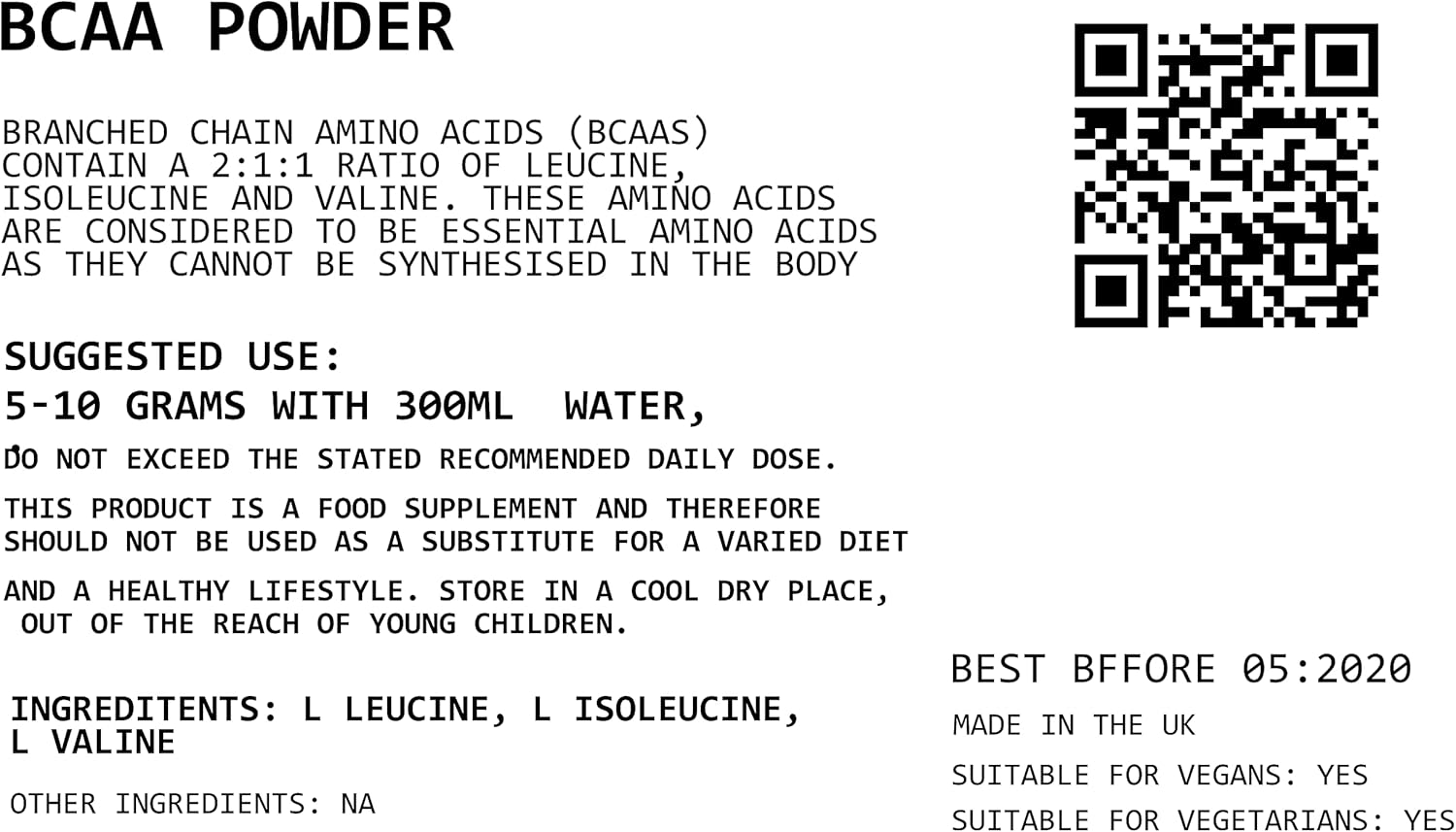 Branched-chain amino acids (BCAAs) are essential nutrients that play a crucial role in muscle growth, repair, and recovery. BCAAs have been shown to help reduce muscle soreness and fatigue, allowing athletes to train harder and longer. They do this by reducing the breakdown of muscle tissue during exercise and supporting muscle recovery after workouts. Branched-chain amino acids (BCAAs) contain a 2:1:1 ratio of leucine isoleucine and valine. These amino acids are considered to be essential amino acids as they cannot be synthesized in the body.INGREDIENTS:Our branched-chain amino acids (BCAAs) supplement is made of L Leucine, L Isoleucine, and L Valine with no added preservatives or harmful ingredients.SUGGESTED USE: Simply mix 5-10 grams with 300ml water, or your favorite beverage and drink or food daily.CAUTION: Do not exceed the stated recommended daily dose.this product is a food supplement and therefore should not be used as a substitute for a varied diet and a healthy lifestyle. Store in a cool dry place, out of the reach of young children.BCAA Powder allows for customizable dosing, so users can adjust their intake based on their individual needs and goals. This ensures that users are getting the optimal amount of BCAAs to support their athletic performance and overall health.Overall, BCAA Powder is an excellent nutritional supplement for anyone looking to support muscle growth, repair, and recovery, as well as improve athletic performance and endurance. With its numerous benefits and ease of use, it is an ideal choice for athletes, fitness enthusiasts, and anyone looking to enhance their physical performance and well-being.