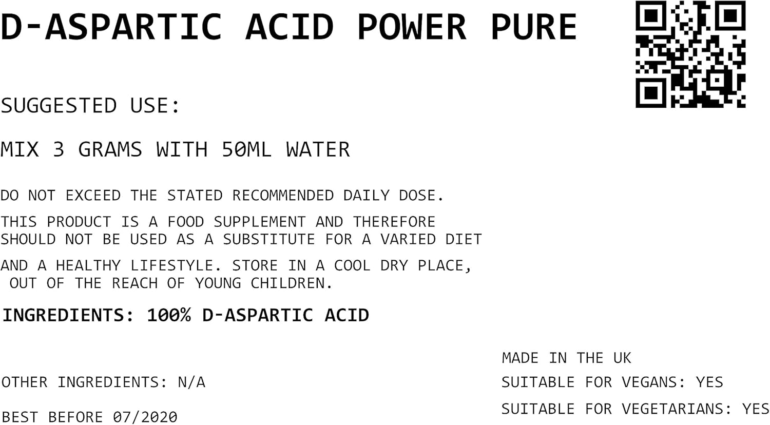 Pure D-Aspartic Acid Supplements Powder is a premium quality nutritional supplement designed to support optimal athletic performance, muscle growth, and overall health.Enhances Brain Function: D-Aspartic Acid is also known to have cognitive benefits. It is involved in the production of neurotransmitters, which are essential for optimal brain function. By increasing levels of neurotransmitters like dopamine and norepinephrine, Pure D-Aspartic Acid Supplements Powder can help to improve mental clarity, focus, and mood.INGREDIENTS:Rapid Strength testosterone boosters supplements contain only 100% d-aspartic acid with no added fillers, additives, preservatives, or harmful ingredients.).SUGGESTED USE: Simply Mix 3 grams of our pre workout powder with 50ml water, or your favorite beverage, and drink dailyCAUTION: Do not exceed the stated recommended daily dose. This product is a food supplement and therefore should not be used as a substitute for a varied diet, and a healthy lifestyle. Store in a cool dry place, out of the reach of young children.Overall, D-Aspartic Acid Powder is an excellent nutritional supplement for anyone looking to support healthy testosterone production, muscle growth, and overall health and wellness. With its numerous benefits and ease of use, it is an ideal choice for athletes, fitness enthusiasts, and anyone looking to enhance their physical performance and well-being.