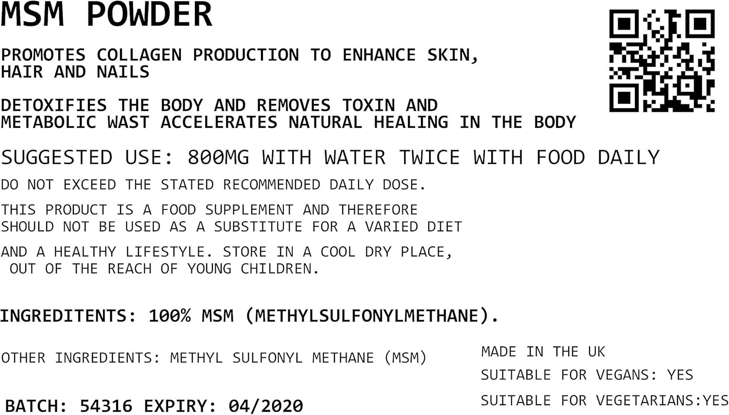 MSM (methylsulfonylmethane) is a pure sulfur compound found in plants, animals, and humans. MSM (methylsulfonylmethane) is an organic compound that is rich in pure sulfur, a substance that is said to be a vital nutrient for one to stay energetic and youthful. It is a key component in the formation of proteins, amino acids, and other essential compounds that the body needs for optimal function. MSM also known as “Nature’s Beauty Mineral” for faster hair growth, promote nail growth, improves skin texture, younger looking skin, may reduce fine lines and wrinkles, restores collagen production and acne improvement, and detoxifies the body.INGREDIENTS:Our MSM powder contains 100% Msm (Methylsulfonylmethane) and is free from harmful ingredients or preservatives. This MSM powder is non-GMO and gluten-free and vegetarians.SUGGESTED USE: Simply mix one scoop (800mg) of msm pure powder into water or your favorite beverage and drink or food daily.CAUTION: Do not exceed the stated dose. Store in a cool dry place, out of the reach of young children.In summary, our MSM powder is a high-quality, pure form of MSM that can provide numerous potential health benefits. From supporting joint health to promoting healthy skin, hair, and nails, msm power organic is full of versatile nutrients that can benefit people of all ages and lifestyles. Try our MSM powder for hair growth organic today and experience the potential benefits for yourself.