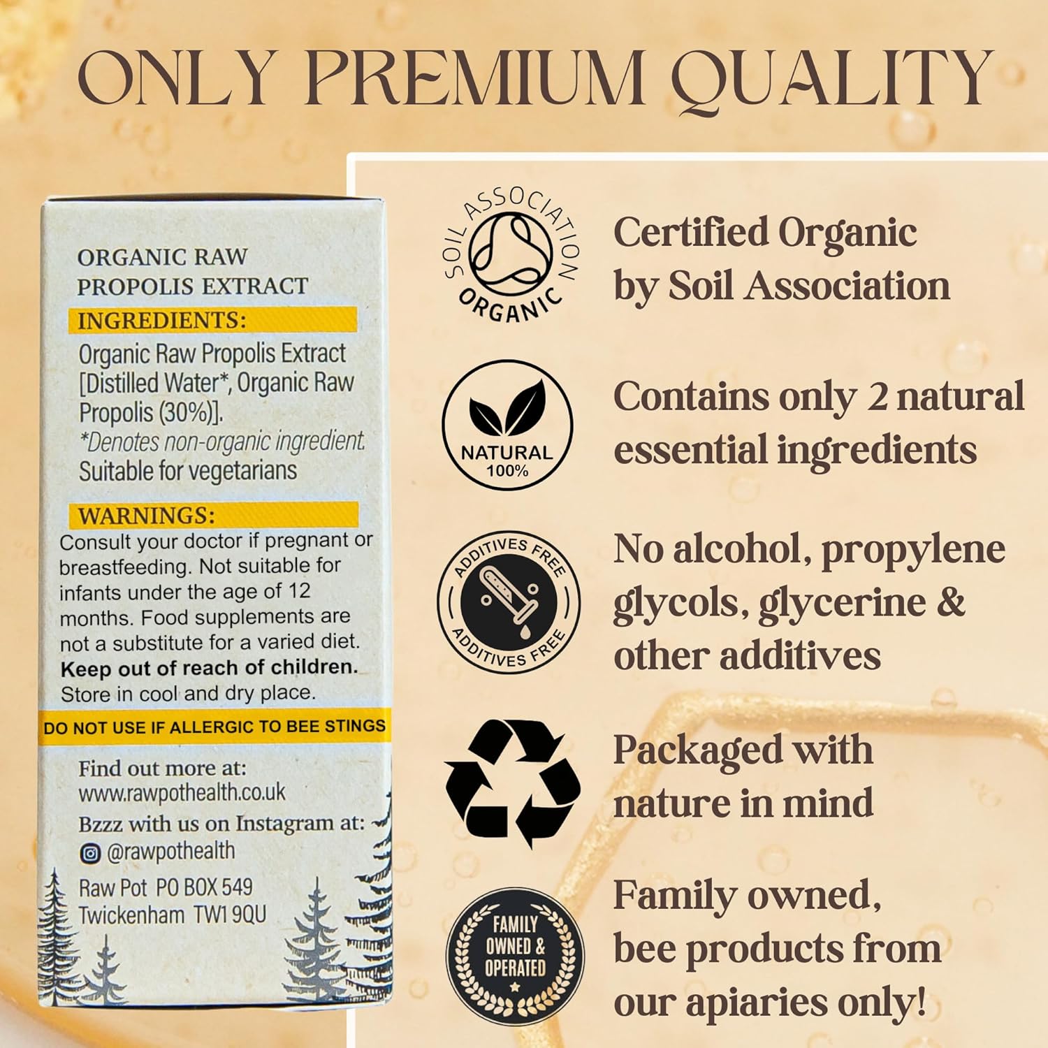 PURE AND UNCOMPROMISED: Free from alcohol, propylene glycol, glycerine, colourings and any other additives and preservatives. Certified Organic by Soil Association. DO NOT USE IF ALLERGIC TO BEE STING.
