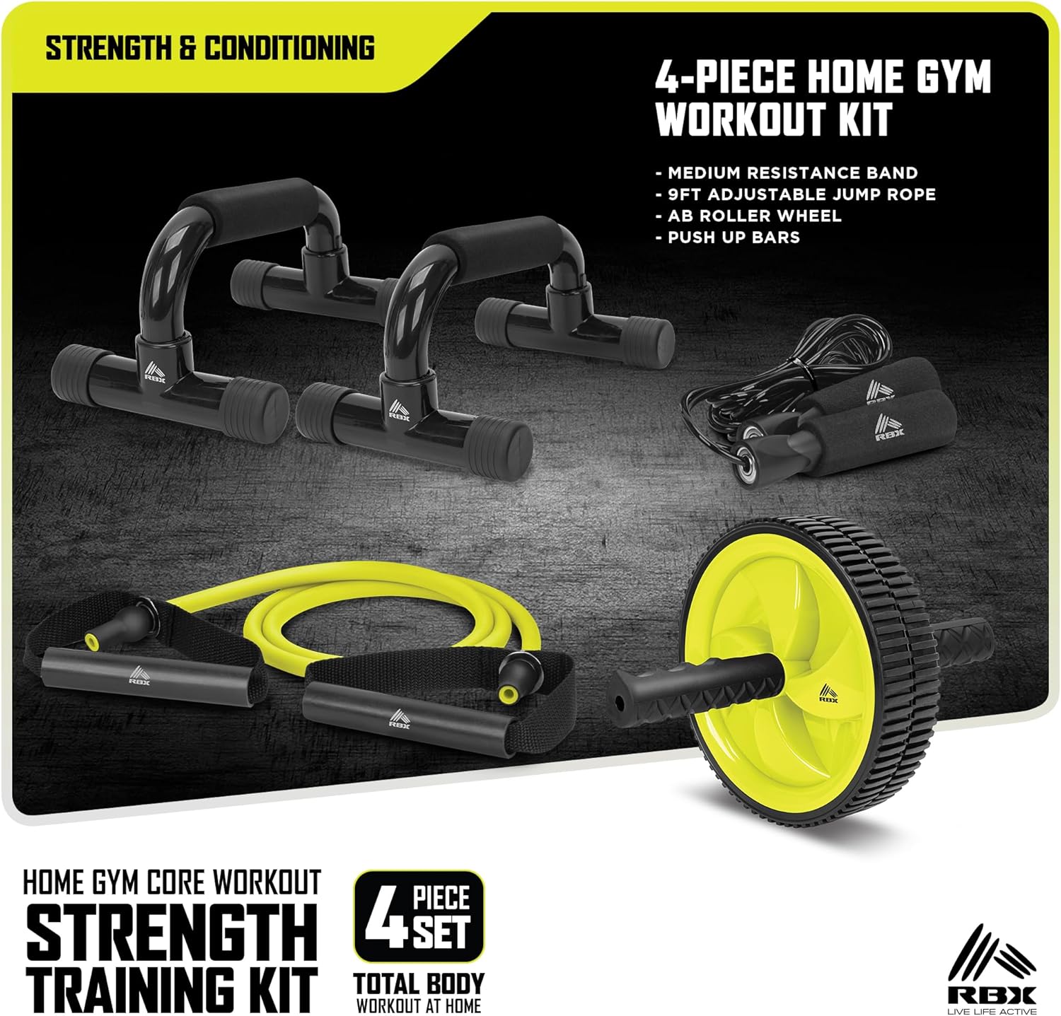 RBX 4 Piece Home Gym Workout Kit – Medium Resistance Band, 9ft Adjustable Jump Rope, AB Roller & Push Up Bars