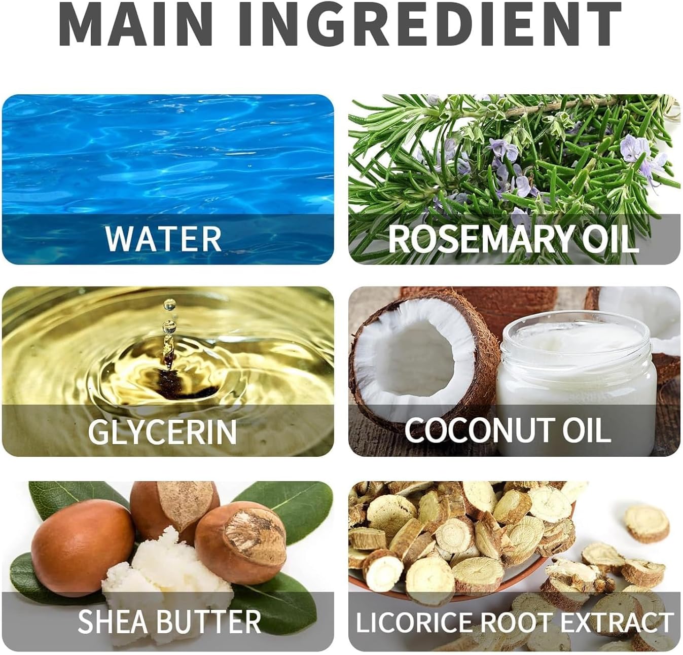 INGREDIENTS: Water, Rosemary Oil, Glycerin, Coconut Oil, Shea Butter, Licorice Root Extract