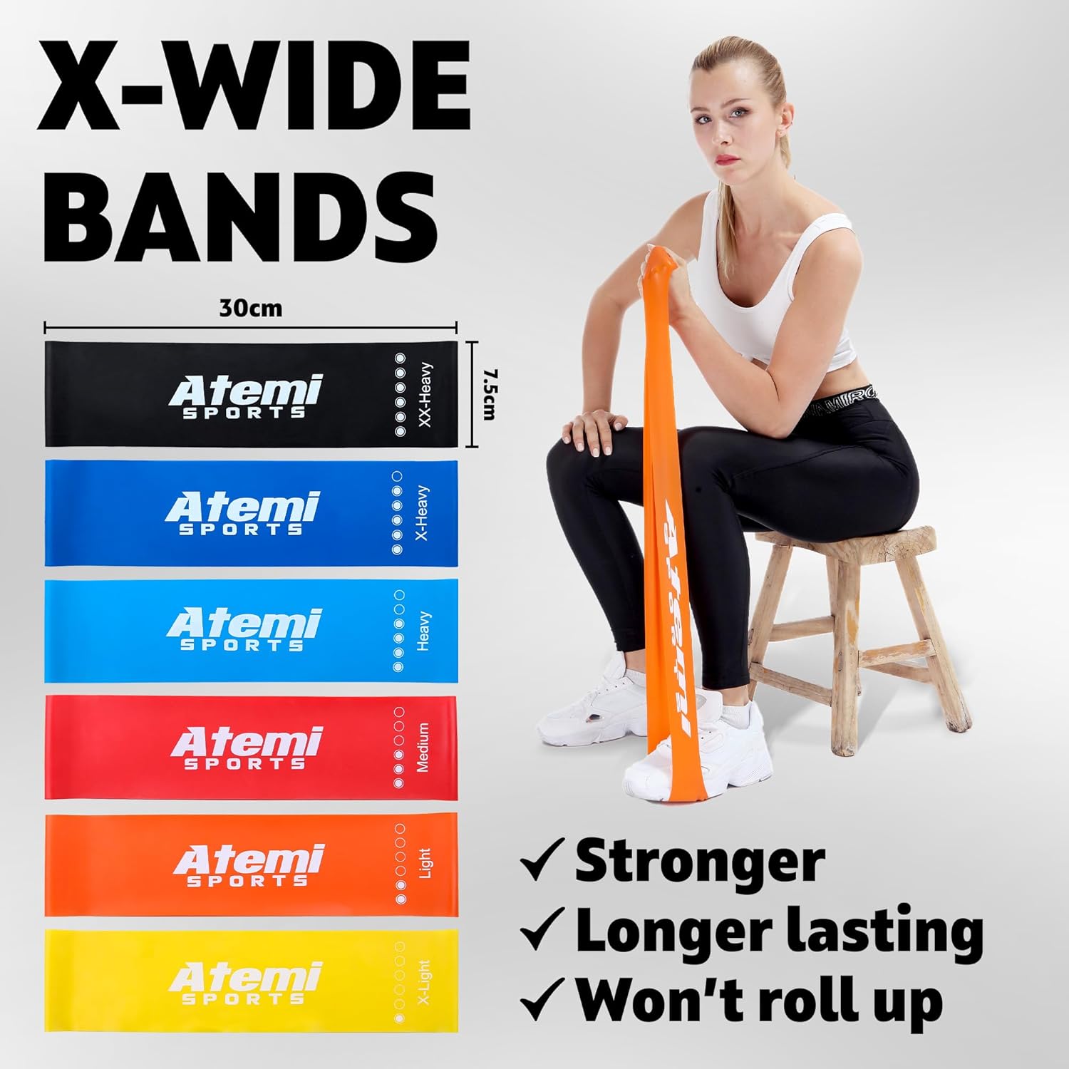 EXTRA WIDE RESISTANCE LOOP BANDS – workout bands with extra width means higher resistance and longer lasting elasticity. 7.5cm width makes them stronger than standard 5cm bands and much less likely to roll up your legs and ruin your workout. Get ready to supercharge your squats, lunges, clamshells, glute kickbacks and much more