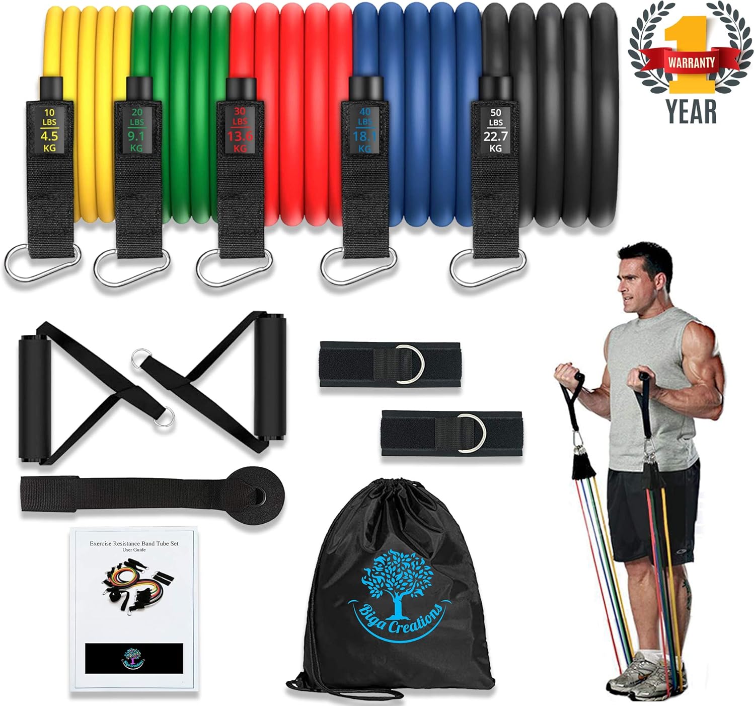 Resistance band set for Men/Women. Home Gym Exercise equipment. Workout fitness tubes stackable to 150lbs with 2 Foam Handles, ankle straps, door anchor & Carrying Pouch. For Physio Pilates Yoga