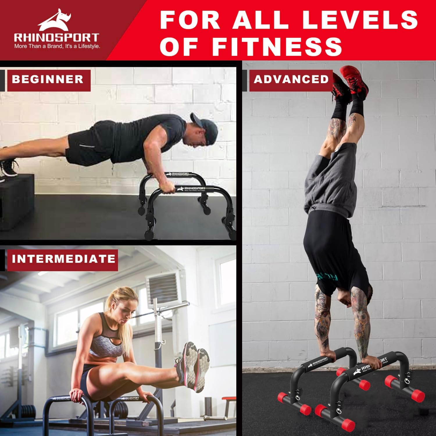 Versatile Upper Body Training: Ideal for targeting upper body muscle groups such as the chest, shoulders, and back, our parallettes offer a versatile range of exercises. From classic push-ups and dips to advanced moves like handstand push-ups, V-sits, L-sits, sit-ups, and various calisthenics exercises, these bars provide ample space and stability for effective bodyweight strength training and stretching routines.