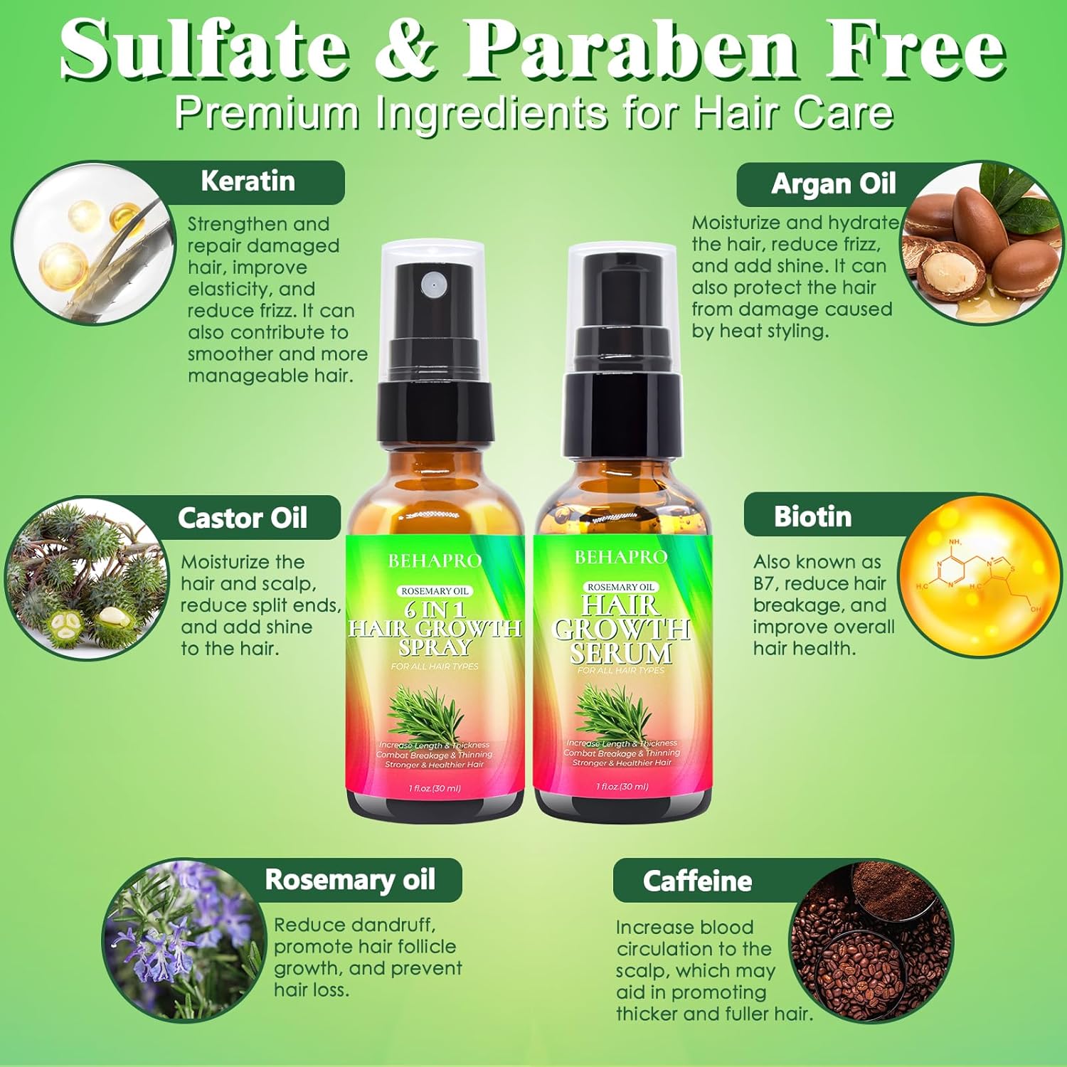 【The Best Combination for Stronger,Thicker Hair】BEHAPRO rosemary oil hair growth products for women men include a rosemary hair growth serum, 6 in 1 heat growth spray and downloadable e-book,offers a comprehensive solution for those seeking to address hair loss,promote hair growth,restore vitality to the hair and repair hair,controls frizz,adds shine to hair and provides heat protection.Suitable for all hair types,including normal,thinning,and frizzy hair.