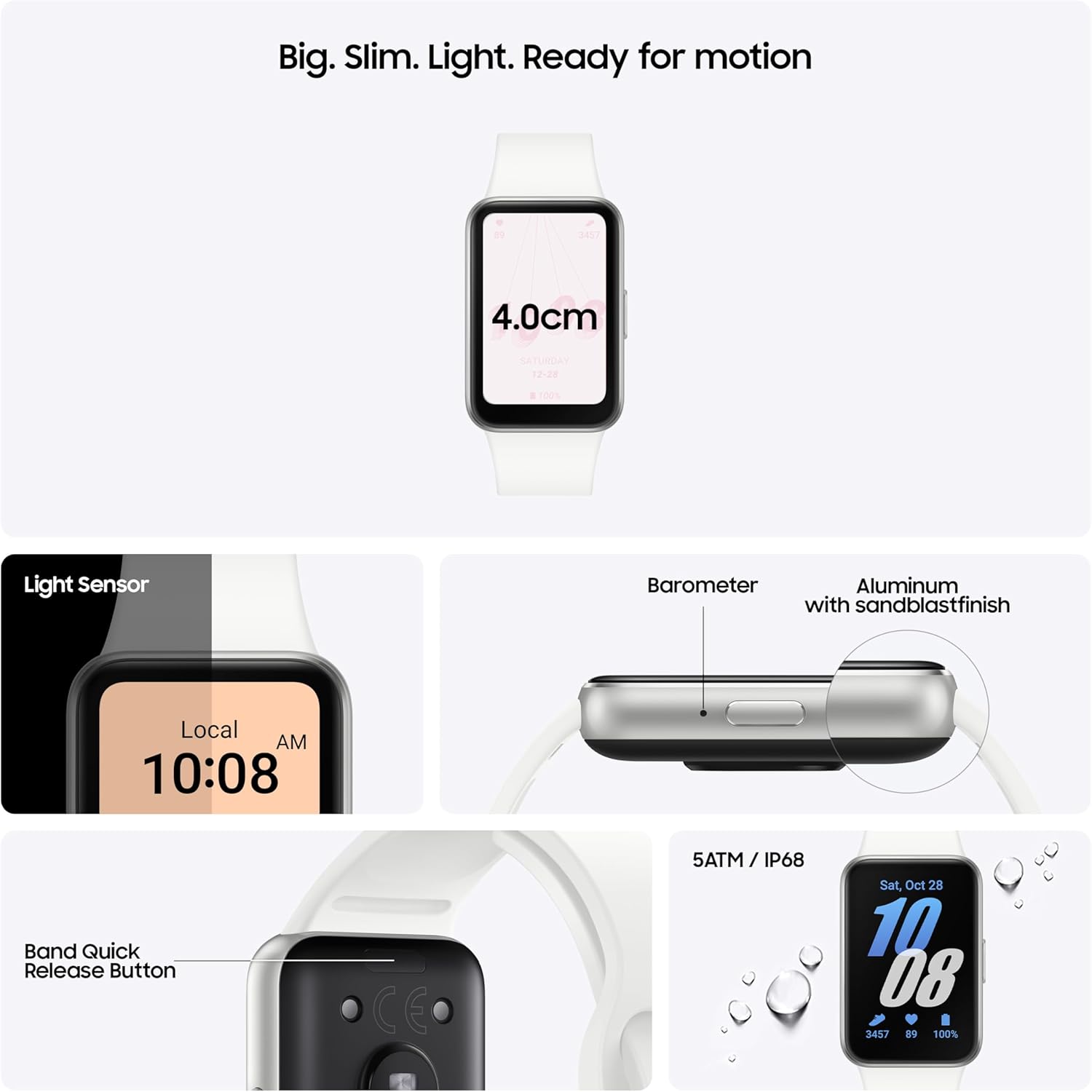 Stay Fit & Enrich your daily lives with the New Galaxy Fit3. It comes equipped with super AMOLED hi-res touch screen with Always On display. Its lightweight, slim and sleek design coupled with super soft FKM straps are ideal for daily wear, fitness & workout tracking & sleep monitoring. Galaxy Fit3 has a large battery that can last up to 13 days depending on different usage scenarios. The Aluminum body and 5ATM+IP68 rating make this device ultra durable & long lasting. Galaxy Fit3 is powered by Samsung’s Galaxy Ecosystem which unlocks the segment leading features and seamless connectivity with Samsung Smartphone devices – camera controls, media controls, fall detection, Emergency SOS & Quick response.
