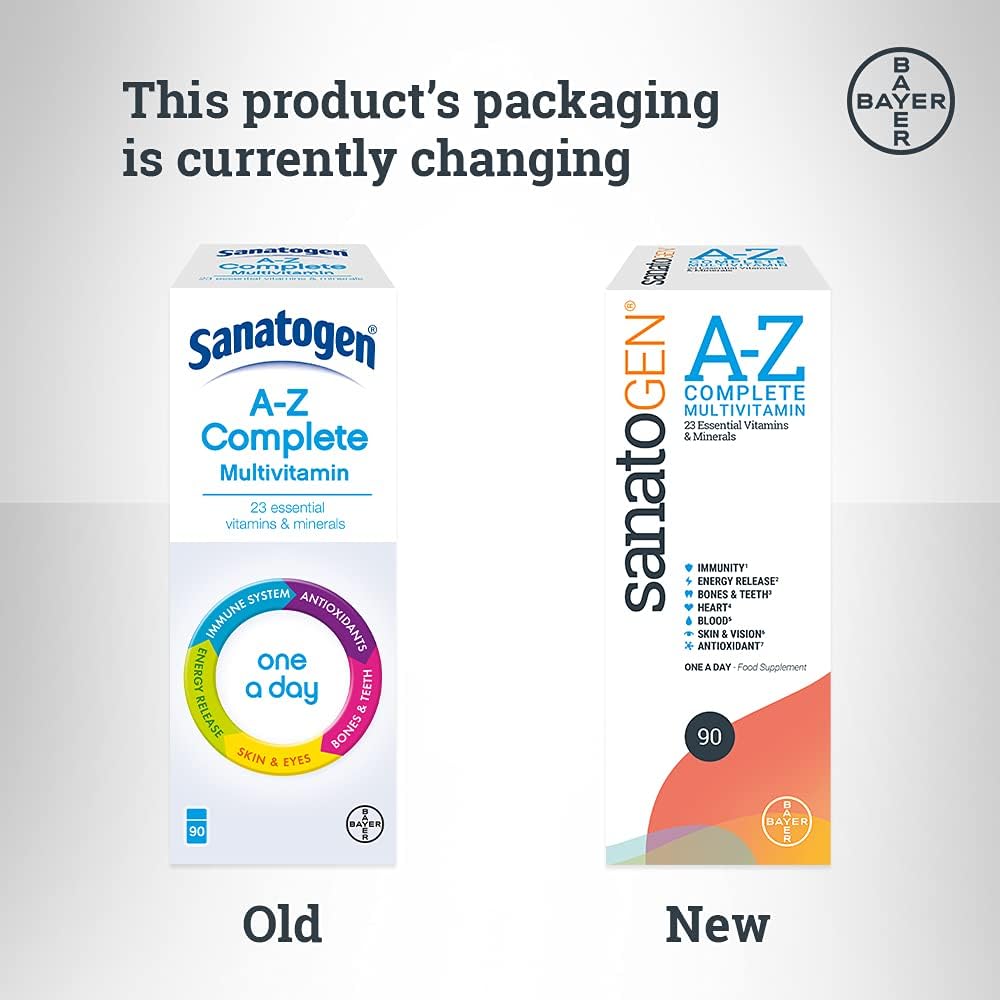 Sanatogen A-Z Complete Multivitamin 90 Tablets – For Men and for Women, Contains Vitamin D, Vitamin C, Iron, Calcium Supplement Product DescriptionWITH ANTIOXIDANTS.Complete multivitamin and mineral with antioxidants to help maintain long-term health. One a day.SANATOGEN GOLD A to Z HELPS TO MAINTAIN LONG-TERM HEALTH:HEALTHY HEART and BLOOD – Calcium, Vitamin B6, B12, Folic acid, Thiamin, Iron.IMMUNE SYSTEM – Vitamin A, C, Iron, Copper, Selenium, Zinc.ANTIOXIDANTS – Vitamin C, E, Manganese, Selenium, Copper.ENERGY – B Vits Complex, Phosphorus, Magnesium, Iron.BONES, TEETH and GUMS- Vitamin A, C, D, K, Magnesium, Calcium. WHY TAKE SANATOGEN GOLD A to Z?Sanatogen Gold A to Z is a complete formulation with 25 essential vitamins and minerals, with antioxidants, specially designed to help maintain long-term health. When taken daily, Sanatogen Gold A to Z helps to ensure that adults with busy lifestyles are getting all the nutrients they need. Multivitamin multimineral food supplement.IngredientsDicalcium Phosphate Magnesium Oxide Maltodextrin Cellulose Potassium Chloride Ascorbic Acid (Vitamin C) Ferrous Fumarate Hydroxypropylmethylcellulose Cross-Linked Sodium Carboxy Methyl Cellulose Zinc Oxide Nicotinamide (Niacin) Modified Starch DL-alpha-tocopherol acetate (Vitamin E) Silicon Dioxide Modified Starch Colours (Titanium Dioxide, Quinoline Yellow, Sunset Yellow) Purified Talc Manganese Sulphate Calcium Pantothenate (Pantothenic acid) Magnesium Stearate Sugar Manganese Sulphate Stearic Acid Starch Copper Sulphate Pyridoxine Hydrochloride (Vitamin B6) Thiamine Mononitrate (Thiamin) Riboflavin Retinyl Acetate (Vitamin A) Mannitol Gelatin Acacia Folic Acid (Folacin) Potassium Iodide Antioxidant (Tocopherol) Soya Oil Chromic Sulphate Biotin Sodium Selenite Vitamin K Cholecalciferol (Vitamin D) Vitamin B12