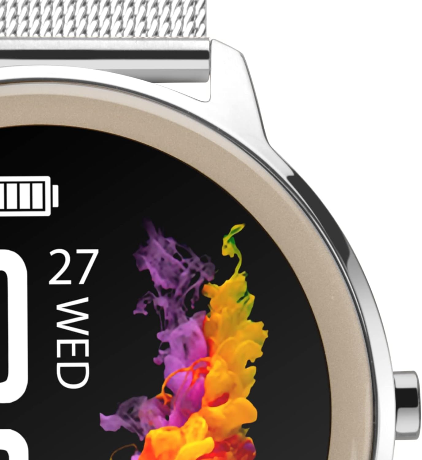CUSTOMISABLE DISPLAY – choose your watch dial style on the home screen by pressing and holding the middle of the screen. Over 100 dial designs can be downloaded on the app, with the option to add a photo to the dial. EXTRA FEATURES – Heart rate & body temperature tracking, 9 default languages, do not disturb mode, countdown and stopwatch timer, drink water reminder, menstrual alerts and remote photo taking