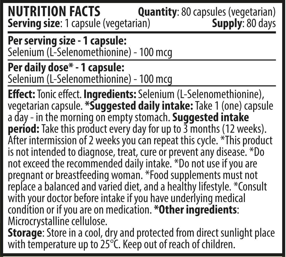 Our high potency and excellent absorption capsules contain 100mCg Selenium per serving. Just one easy to swallow Selenium capsule gives 100mcg of Selenium