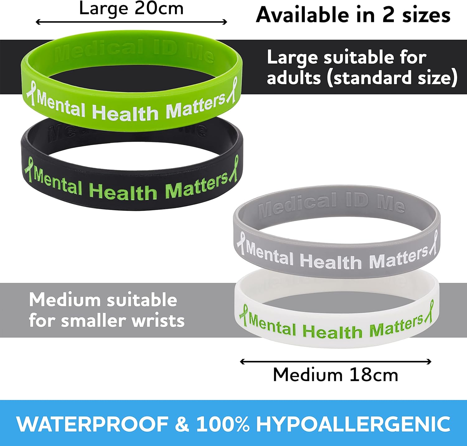 SUPPORT MENTAL HEALTH: These wristbands are a great reminder that ‘Mental Health Matters’. Wearing one of these wristbands will remind you of that each time you look at it. They are also great gifts for friends and family who may be struggling with mental health. They are also a great way to raise awareness for mental health.100% WATERPROOF & HYPO-ALLERGENIC: These wristbands are fully waterproof so no need to ever take them off! They are also 100% hypo-allergenic (non toxic) and are made from debossed ink filled siliconePACK OF 4: This listing is for a pack of 4 wristbands. One of each colour will be sent out. Please choose size when ordering.