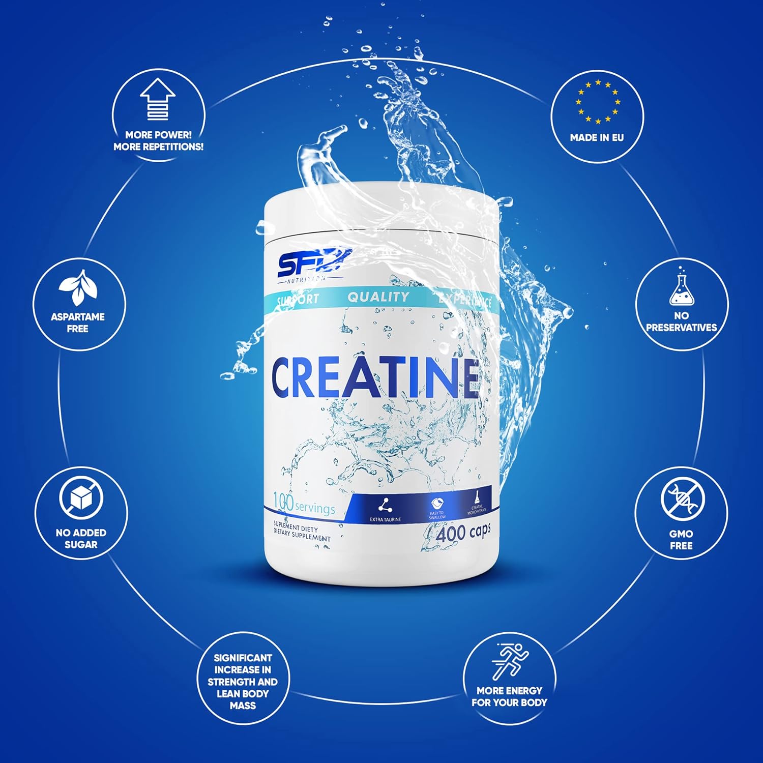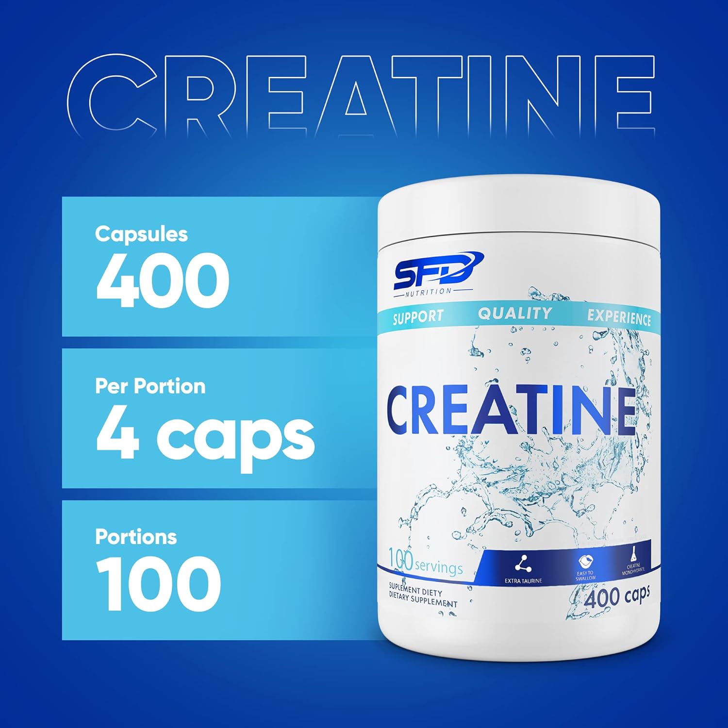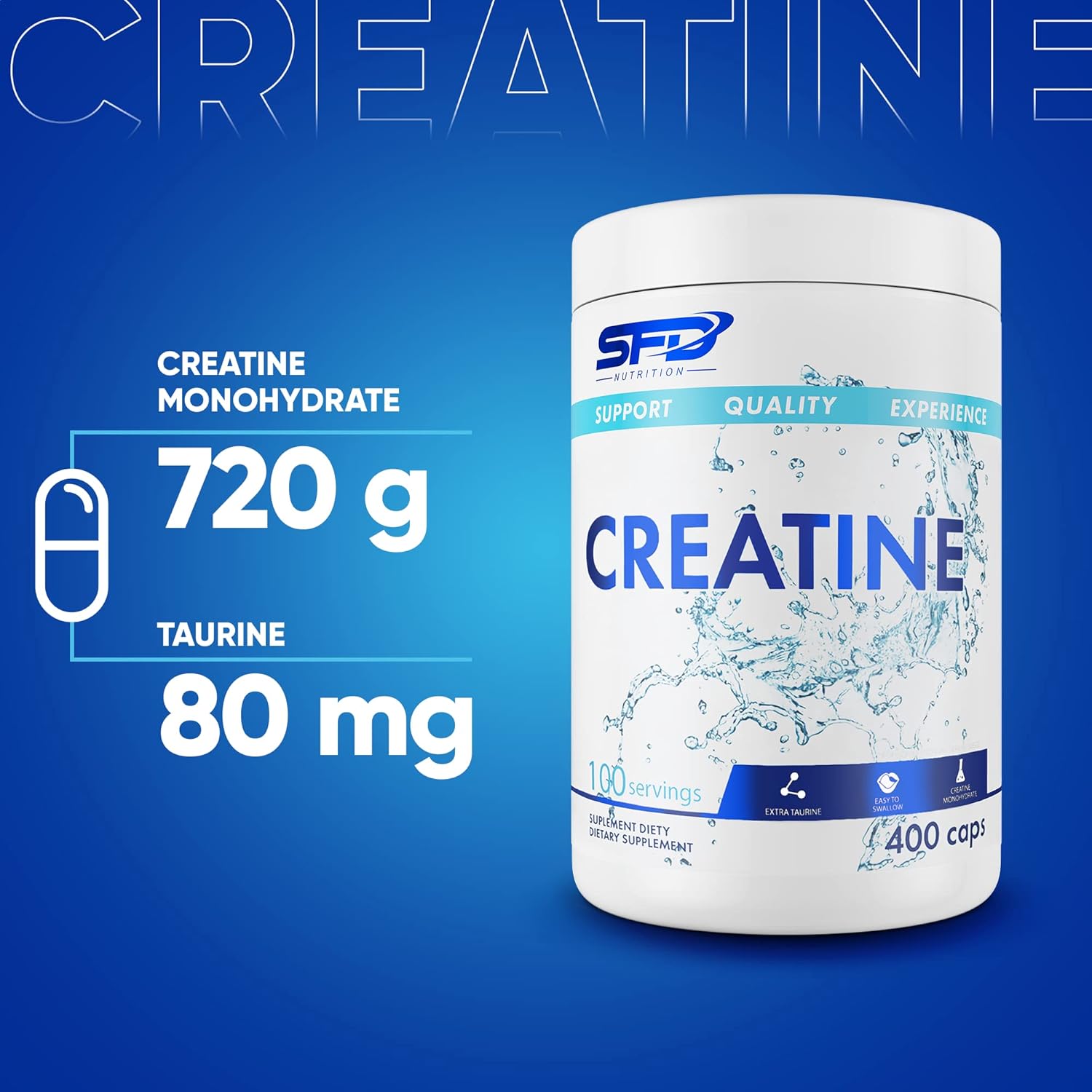 SFD Creatine Monohydrate Caps with Taurine – Pre-Workout Gym Supplements – Performance Boost and Post Workout Muscle Recovery – No Additives – 400 Capsules