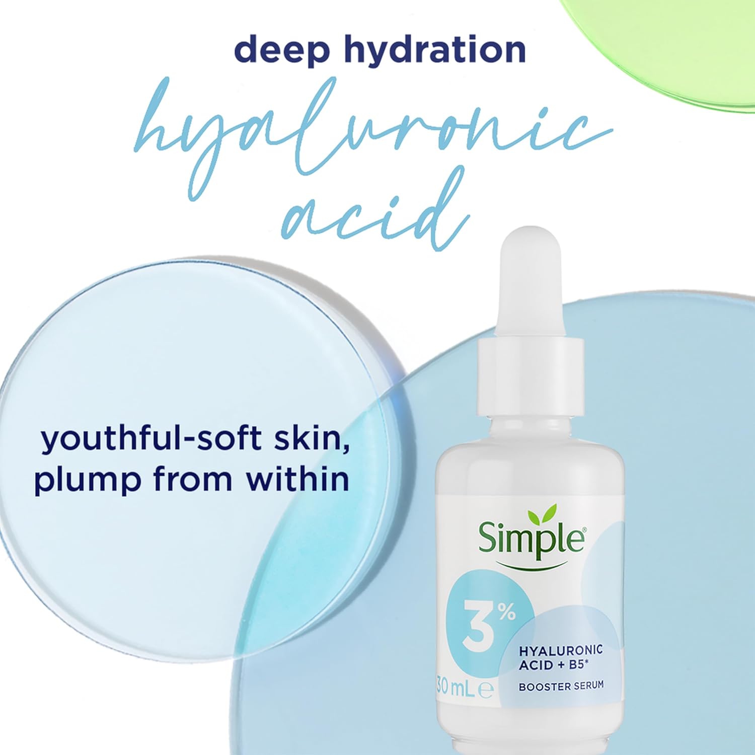 The hydrating kind! Simple 3% Hyaluronic Acid + Vitamin B5* Booster Serum locks in moisture to make dry and sensitive skin instantly softer and more youthful-looking