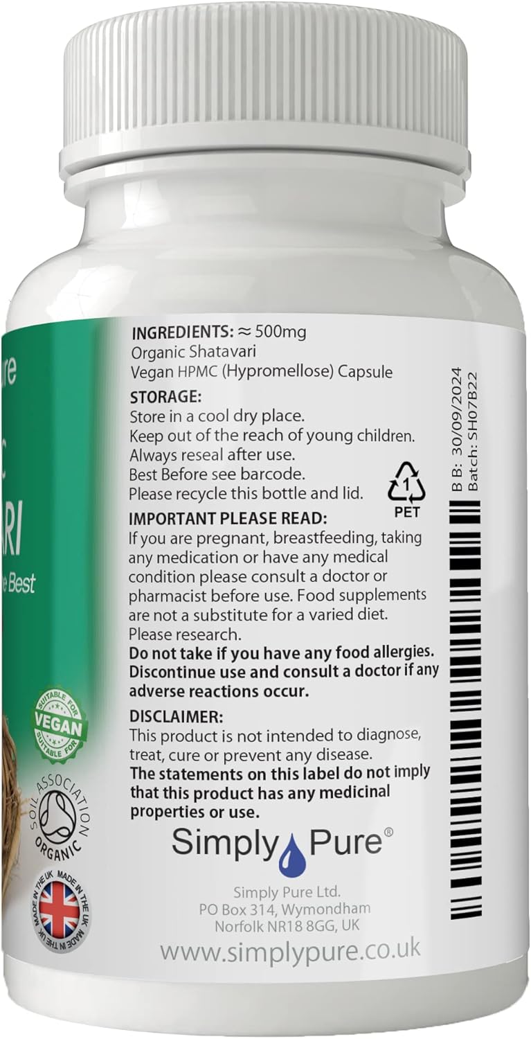 Simply Pure Organic Vegan Shatavari Capsules x 90, 500mg, 100% Natural Soil Association Certified, Gluten Free and GM Free