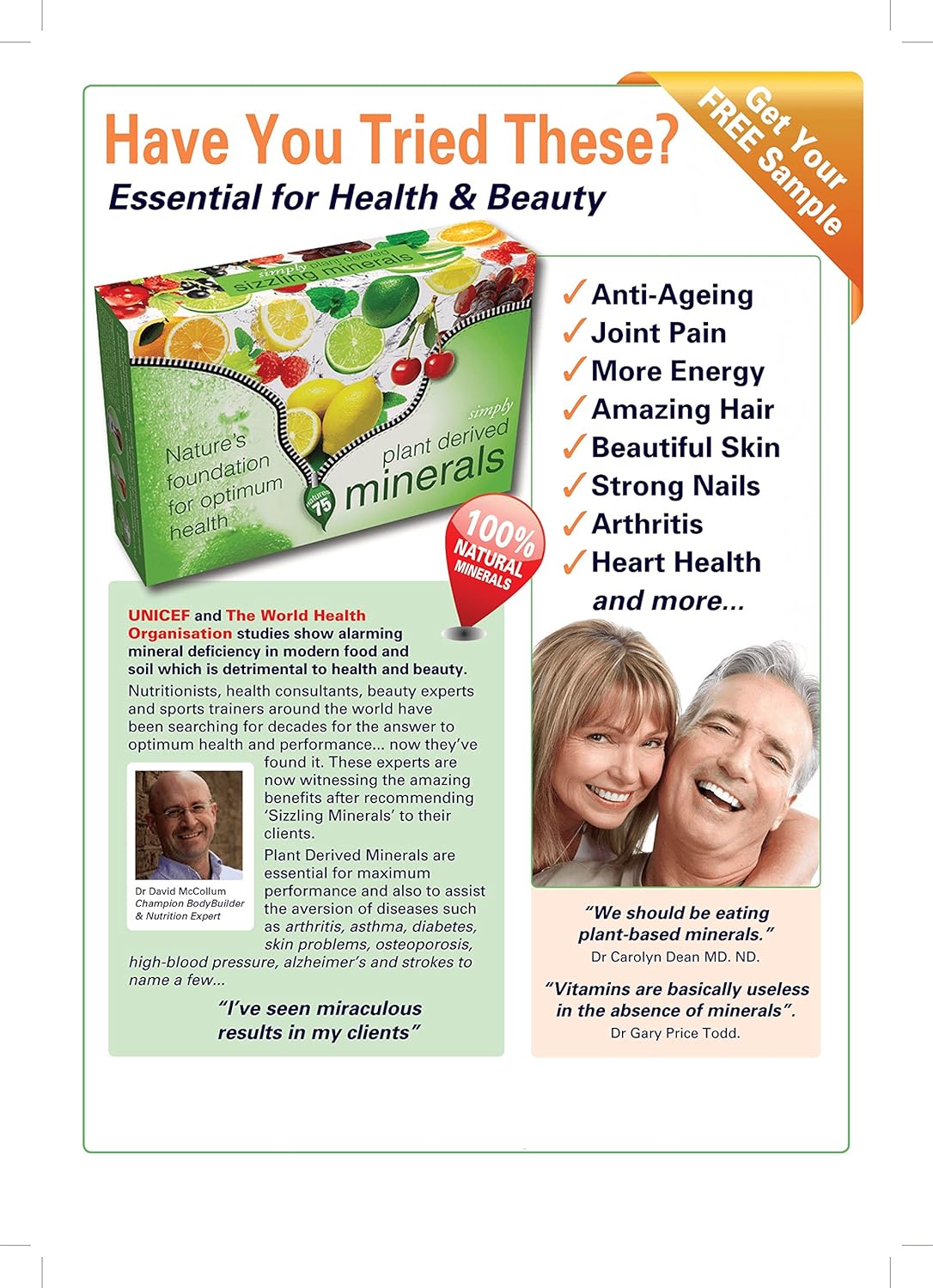 Colour: Orange&Natural Flavour, Brand: Simply Naturals 98% of your body is comprised of minerals. We need a minimum of 60 trace minerals in order to maintain a disease and ailment free state. Pure plant-derived minerals are highly absorbable unlike the metallic minerals usually found in shops, Sizzling Minerals are the world’s first and ONLY effervescent wafer (tablet) containing 600mg of 75 Pure plant-derived minerals. 15 wafers per Tube and two Tubes in one Box, one month supply. Suggested Use – Take 1 to 2 tablets daily; fully dissolve in a glass of drinking water. Orange Flavour Simply Naturals Sizzling Minerals. Did you know: A correct balance of vitamins and minerals are essential for health and beauty Vitamins are basically useless in the absence of minerals. Vitamins cannot be processed correctly by the body without the correct amount of Minerals. Most mineral formulations contain no more than 10 to 15 minerals and are metallic minerals UNICEF and The World Health Organisation studies show an alarming mineral deficiency in modern food and soil which is detrimental to health and beauty. Dr Linus Pauling (two-time Noble Prize Laureate) has stated “You can trace every sickness, every disease and every ailment to a mineral deficiency” Dr Gary Price-Todd states “The human body requires at least 60 minerals in order to maintain a disease and ailment free state” Sizzling Minerals Introducing the world’s first and only, great tasting effervescent Wafer (tablet) containing 600 milligrams of 75 Pure Plant Derived Minerals. 4 Delicious flavours: Natural, Orange, Lemon+Lime, Cherry Berry Sizzling Minerals is the most important product available for fulfilling the nutritional needs for the entire family. You will receive the two Tubes of Sizzling Minerals securely packed in a padded envelope. Changes in health may be noticed quite quickly in some individuals though 3 months is a realistic time span in which to feel the benefits of taking the minerals.