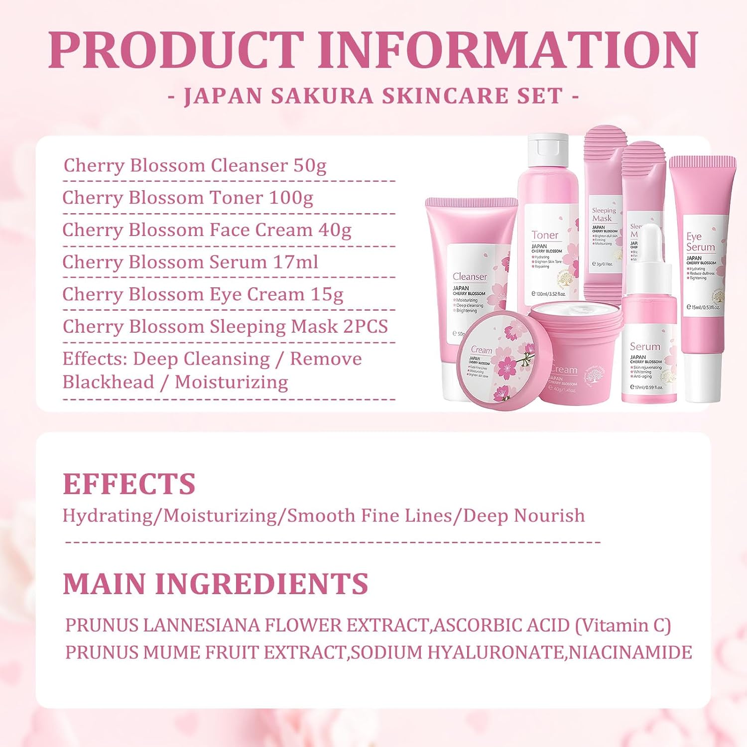 ❀【Skincare Gift Set】Our 7-piece beauty gifts sets for women Skincare Routine contain Cleanser (50g), Toner (100g), Blossom Face Cream (40g), Serum (17ml), Eye Cream (15g), Sleeping Mask (2PCS).A complete set of skincare essentials to pamper and nourish the skin.