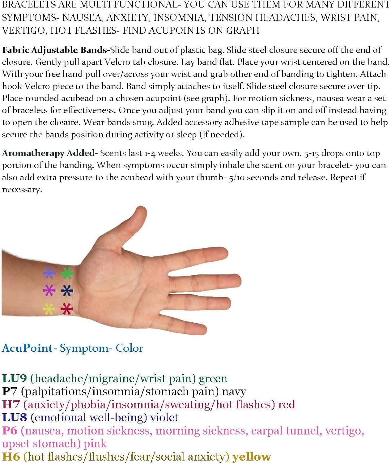 Pressure Point and Use Information H7 aids to treat emotional imbalances, nervousness, anxiety, hyperactivity, palpitations, fear, and forgetfulness. In addition, it also helps to treat insomnia, irritability, stress and chest pain. This point also assists with relaxation. P7 relieves insomnia, stress, hot flashes (flushes), manic behavior, palpitations, sweating, stomach pain, and vomiting. LU9 relieves palpitations, stress headaches, nervousness, poor circulation, headache, migraine, neck rigidity, cough, asthma, sore throat, toothache and wrist pain. P6 relieves nausea, vertigo, motion sickness H6 relieves palpitations, perimenopause symptoms. LU8 is used for emotional well being. Certified medical banding manufactured in the USA. Double support closure. Hook and Loop closure/Metal Slide-on support loop. Hand wash and lay flat. Can be worn in wet and dry conditions. This is not a medical device and may not relieve symptoms for all people. Proper placement of the bead per pressure point is necessary for the band to be effective. If you are new to acupressure please be advised that it may take 1-7 days to locate the point that works best for you. Please be patient. If you need any assistance with your purchase please direct msg us or email us. All contact info is included with your purchase. Our products feature VELCRO Brand fasteners. Smells great and helps!!