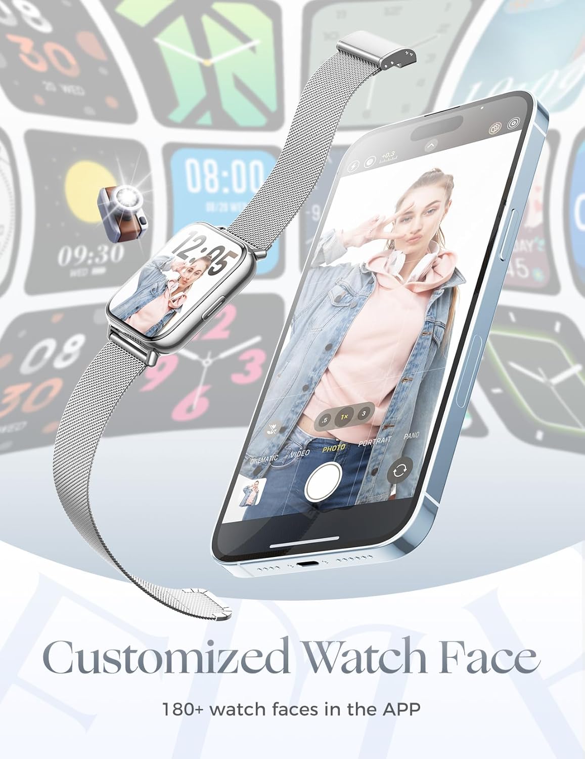 📱 1.85″ Touch Screen & Custom Watch Dials: The smart watch for women have a 1.85″ HD touch screen with 240*280 HD resolution, flexible touch response, and detailed image quality, bringing you a unique visual and better interactive experience. There are more than 200+ custom dials for you to freely change, which vividly reflects your personalization. Also, the adjustable screen brightness makes the smartwatch easy to read in the sun.