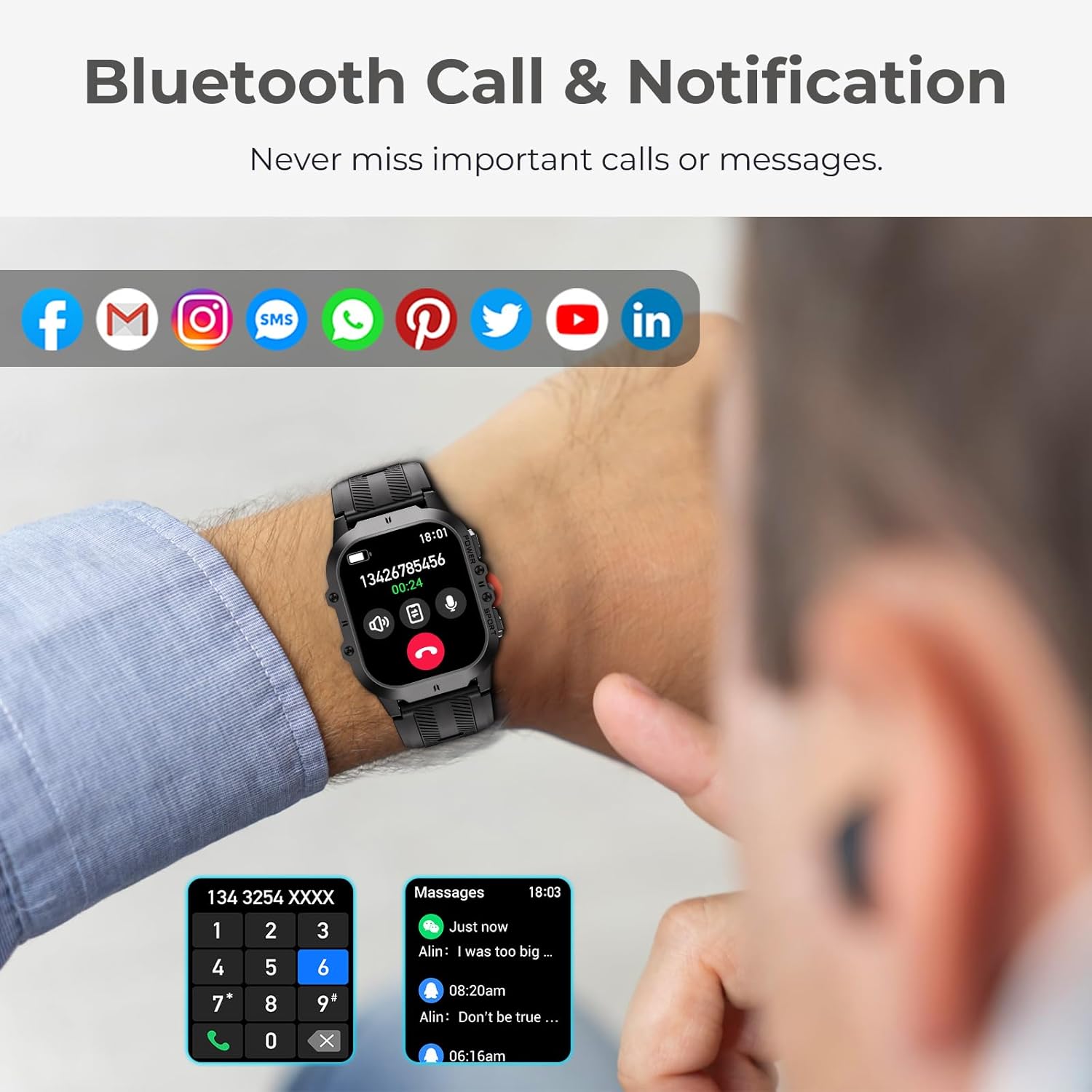 📞【Bluetooth Call & Smart Notification】The smartwatch for men equiped with a Hi-Fi speaker and a high-quality waterproof microphone, enabling you to answer or reject calls, view call logs, and receive WhatsApp, Facebook, and other messages directly from your smartwatch. This added convenience comes in handy when you find it challenging to answer calls at work, during meetings, or at the gym, ultimately enhancing your daily life.
