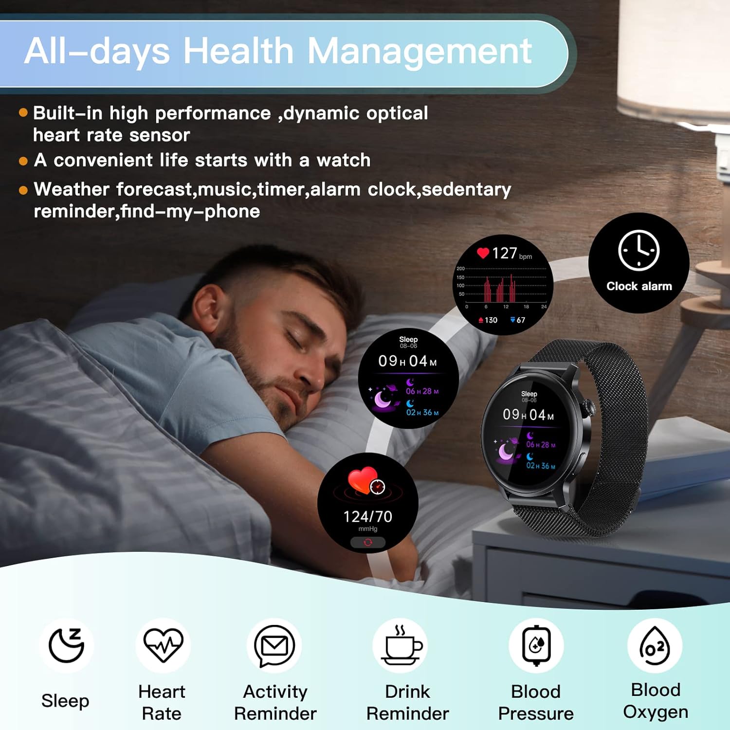 【More Practical Features】:Sedentary, drink water, reminder, alarm clock, calendar, stopwatch, timer, music control, remote control camera, weather forecast, and more. Every gadget is designed to bring you more convenience.