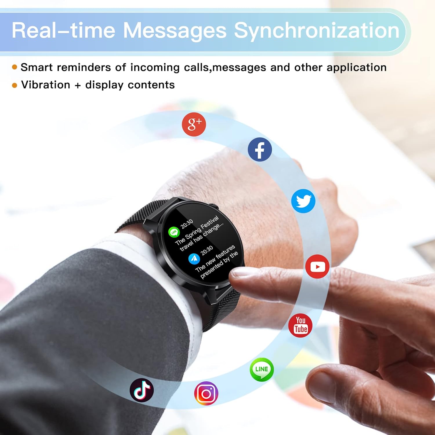 Call,SMS reminderAlarm clock , incoming call, SMSReal-time viewing of social messages : Facebook , Twitter, LinkedIn , whatsAPP, YouTube ,Skype,Messenger,Pinterest, Hangouts , Tumblr , Viber , Line, Instagram, Google+,Snapchat ,Gmail, Flickr, VK , KaKao Taik ,Telegram, Sedentary , WeChat , QQFind mobile phone,sedentary reminder and other functions are convenient for you.