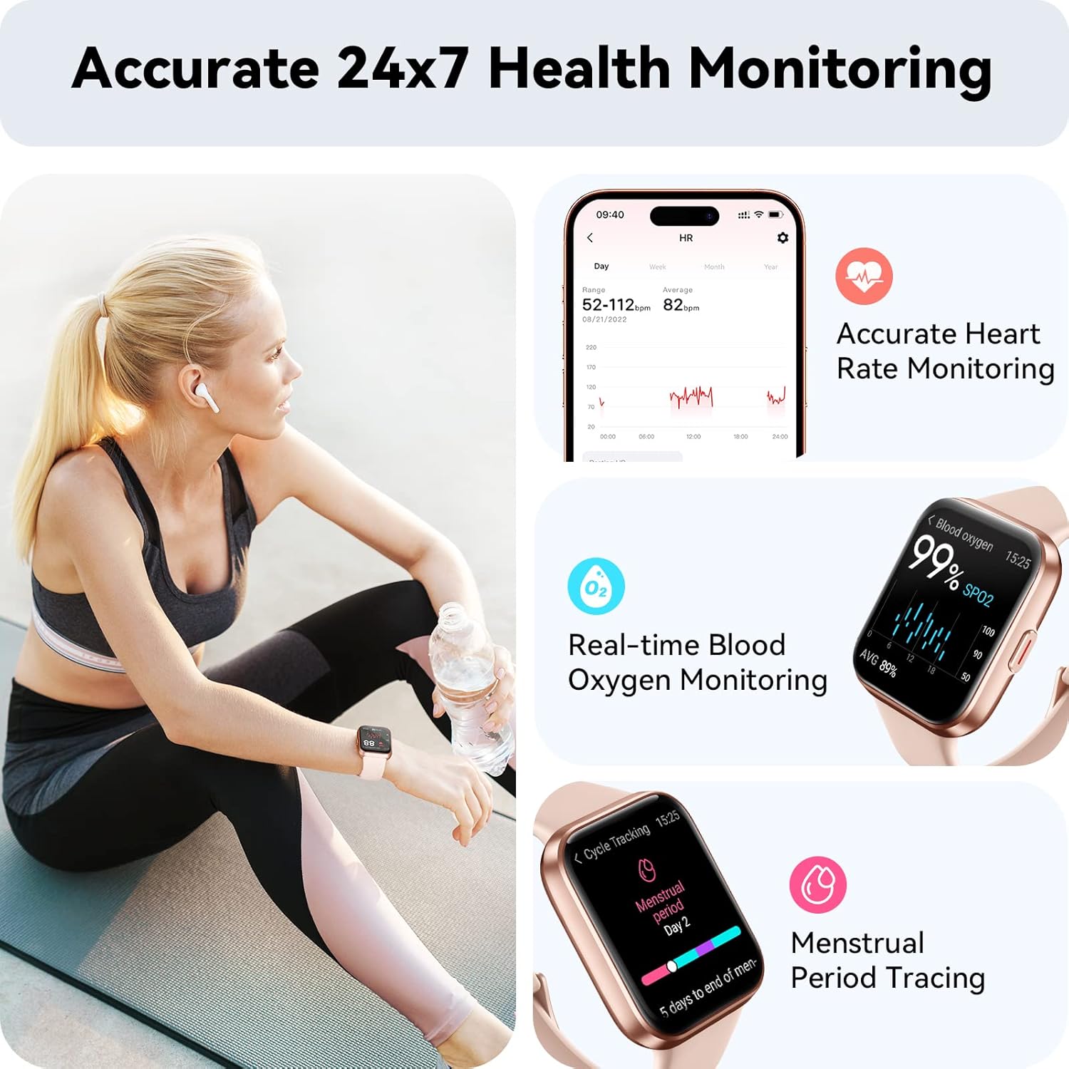 【Comprehensive Health Monitoring】Accurate and continuous heart rate, blood oxygen, and sleep monitoring, getting reminders for high heart rates and low blood oxygen levels provide you with a comprehensive insight into your physical wellbeing. This smart watch tracks your sleep status (deep sleep, light sleep, wake) and provides you with a sleep quality analysis. It also has female cycle reminder function. All these help you better understand your health status and to make adjustments.