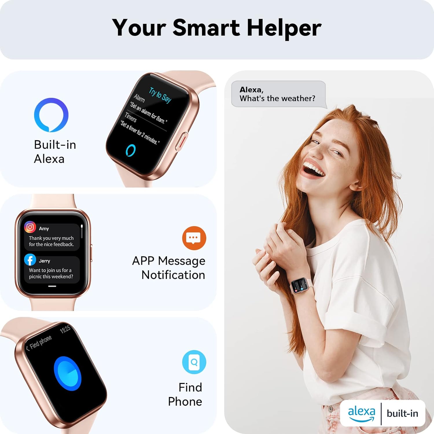 【Calling Function & Built-in Alexa】Connect your phone to the smartwatch and easily make or take calls from your wrist. You can even add up to 10 of your favorite contacts onto the smart watch for even quicker access. Receive App notifications from popular social apps like Whatsapp, Facebook, and more. With built-in Alexa, you can let the watch help you do more. You can ask questions to open different fitness modes, set alarms and timers, and control smart home devices.