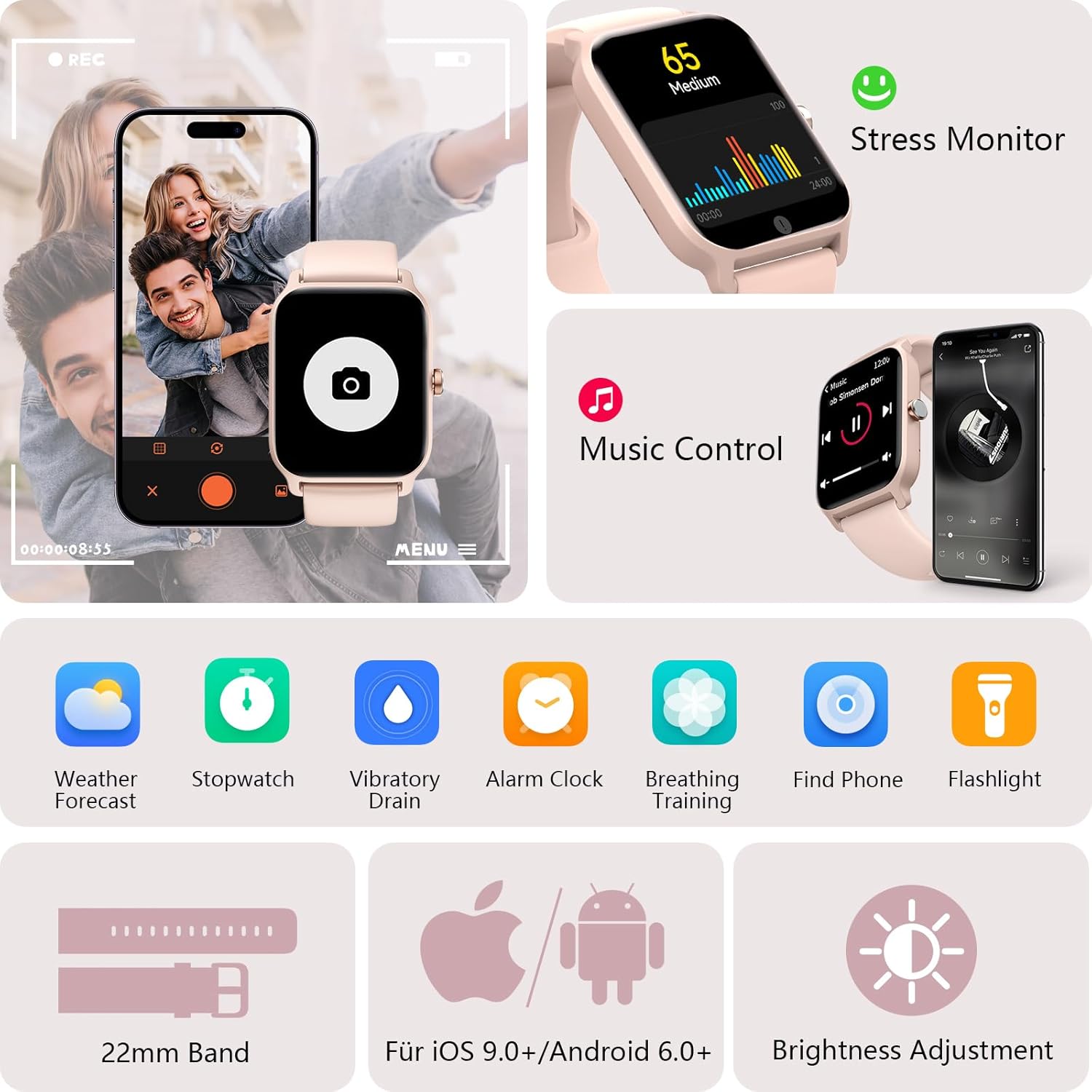 💕 【Blood Oxygen & Heart Rate & Sleep Monitoring】The smart watch for women uses an advanced sensor chip and a photoelectric sensor for accurate monitoring. It provides 24-hour continuous measurement of your health indicators (SpO2, heart rate, and stress), as well as women’s menstrual cycle reminders. In addition, the ladies smart watch automatically monitors your sleep status (deep sleep, light sleep, waking up) and provides a comprehensive sleep quality analysis, so better sleep starts now.