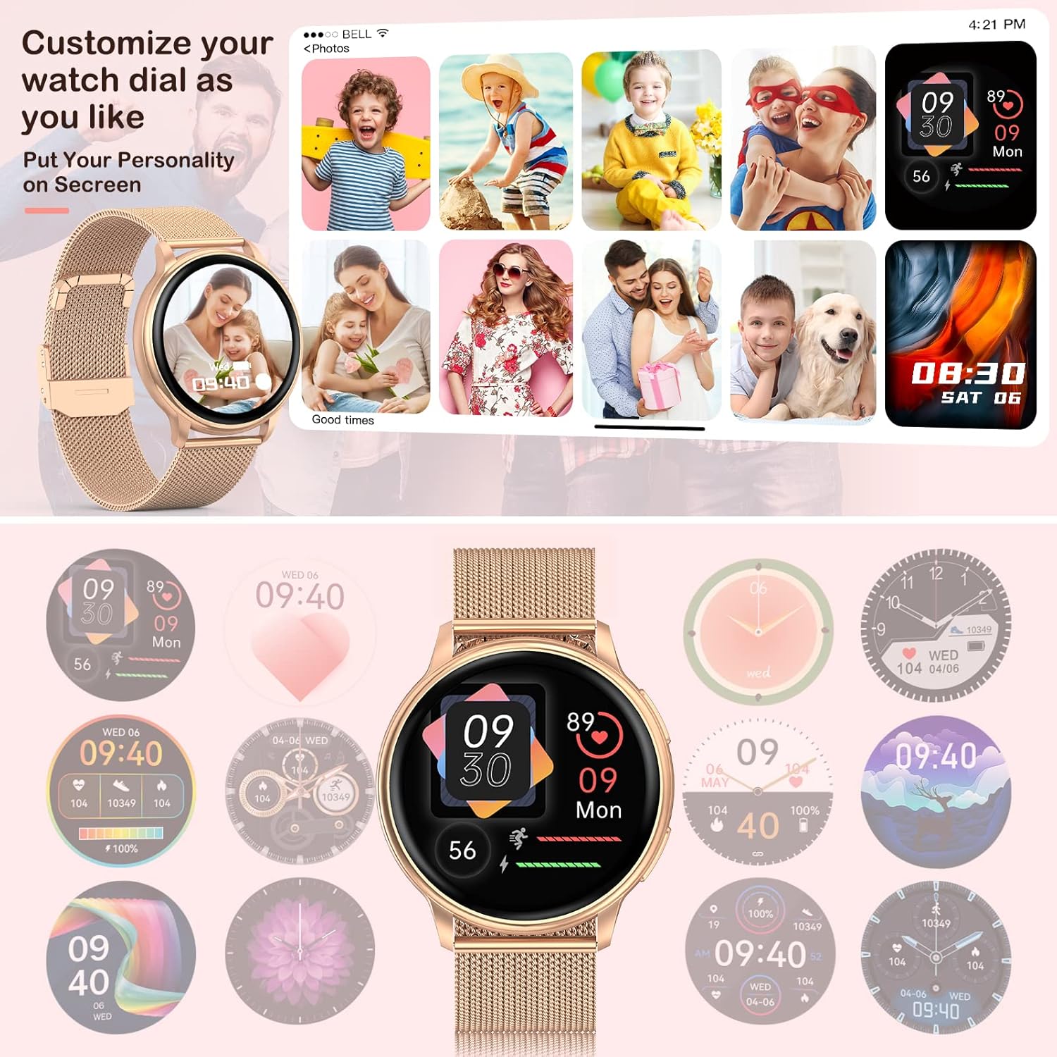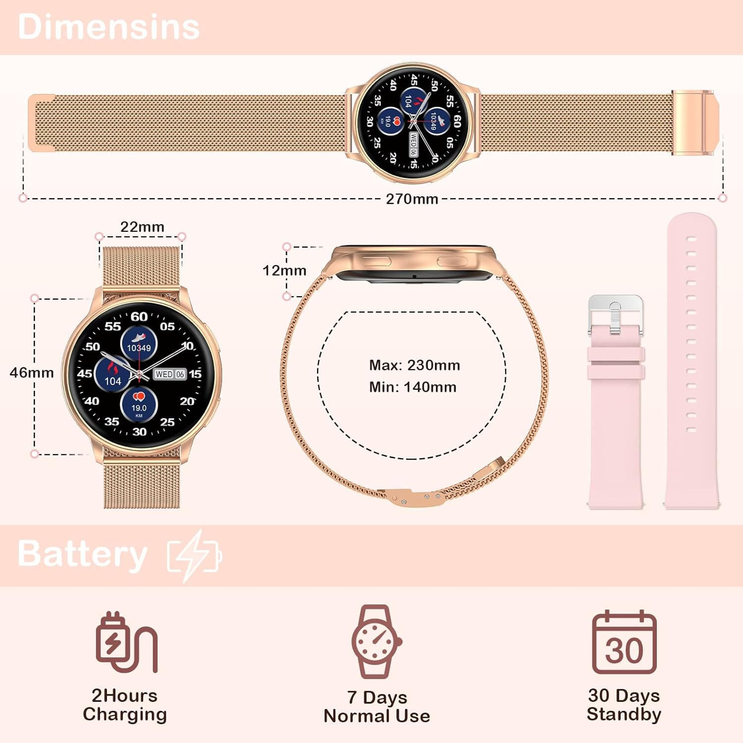 ⌚【Multifunctional Women Smart Watch】The rose gold smart watch for women compatible with Android iOS is IP67 waterproof (allows to wash hands,not sea water or hot bath due to steam, which will corrode the chip) supports multiple languages. There are more convenient functions like weather forecast, find phone function,remote camera, stopwatch, flashlight, blood pressure ect.It can meet your daily needs.