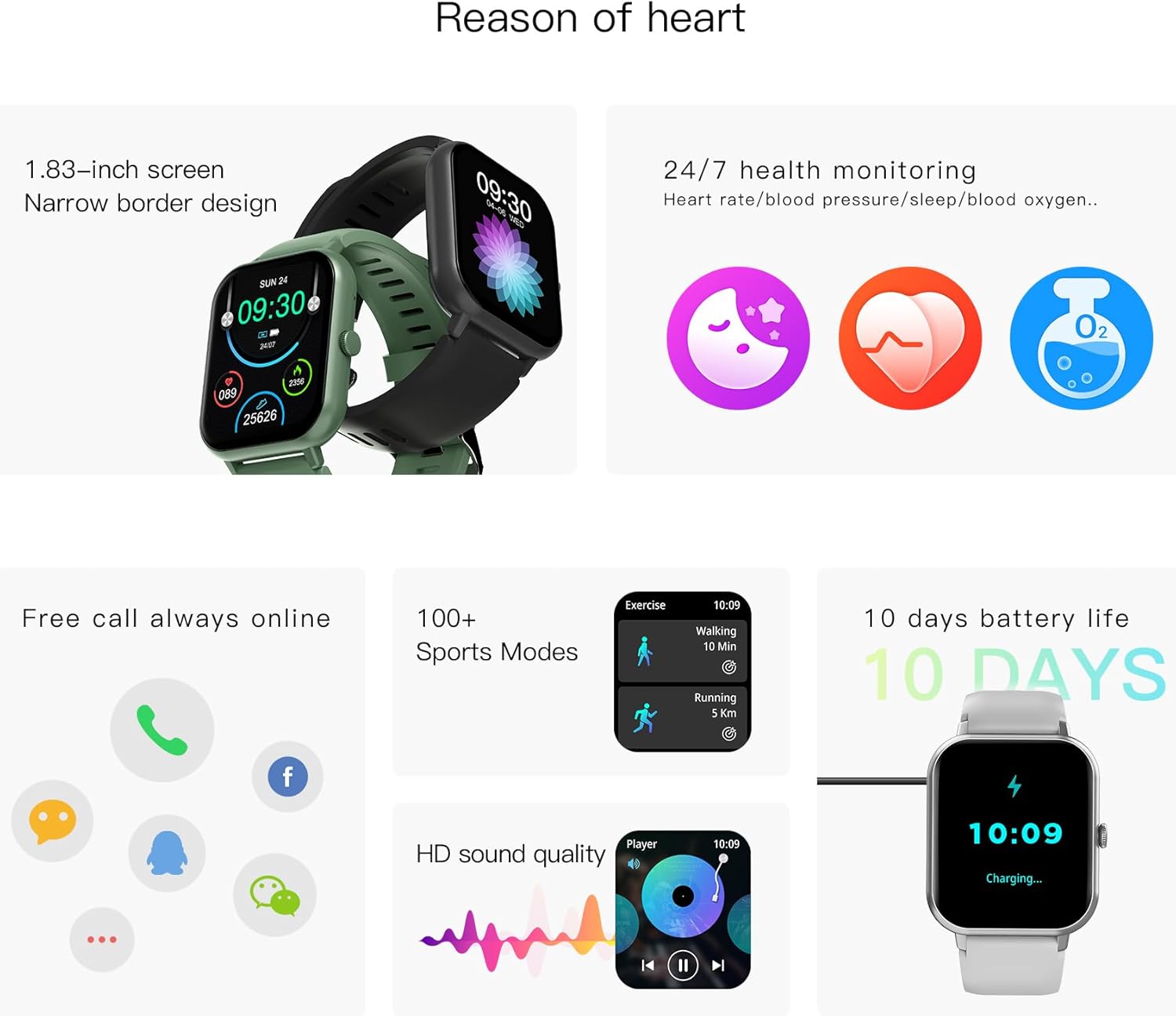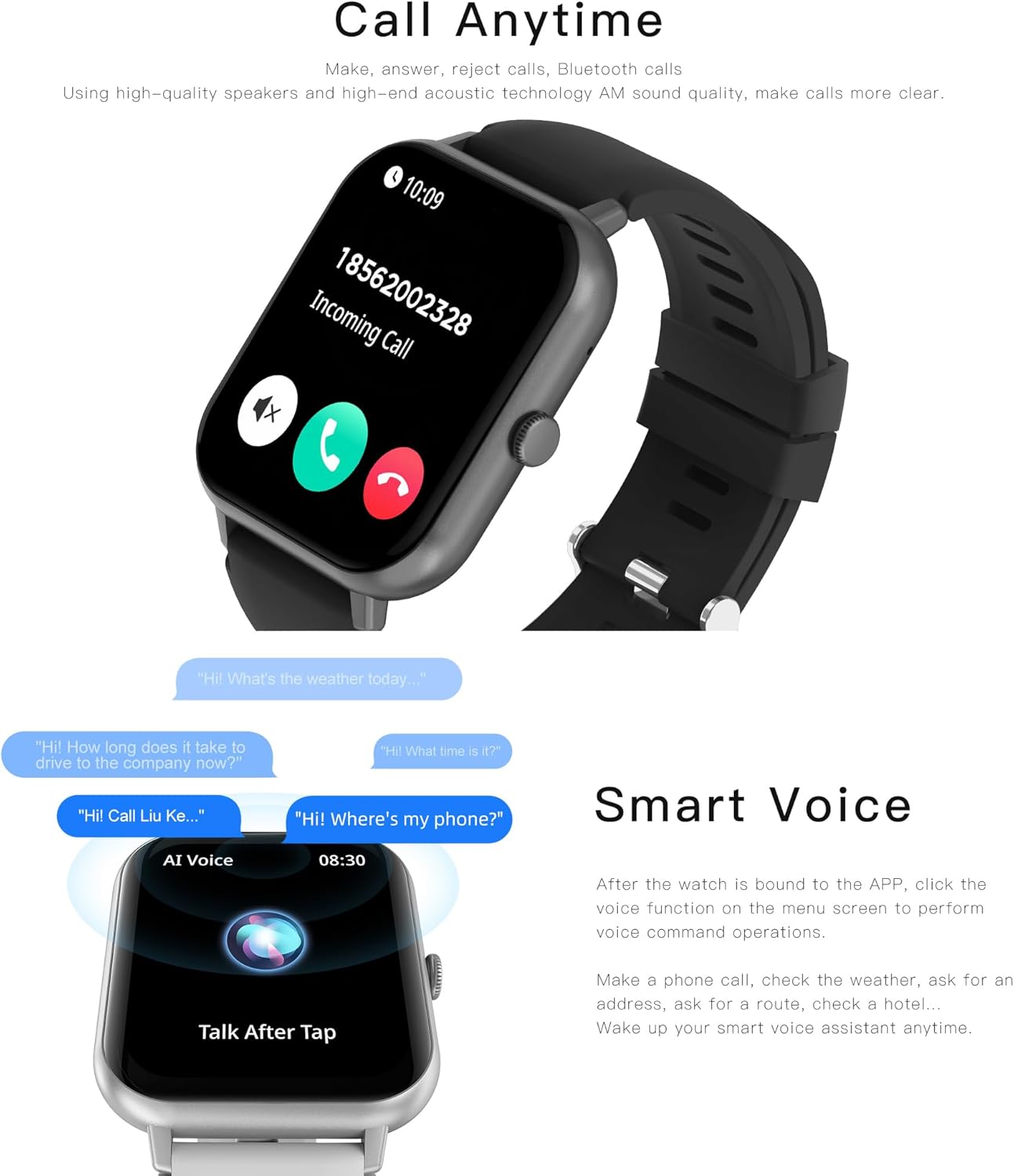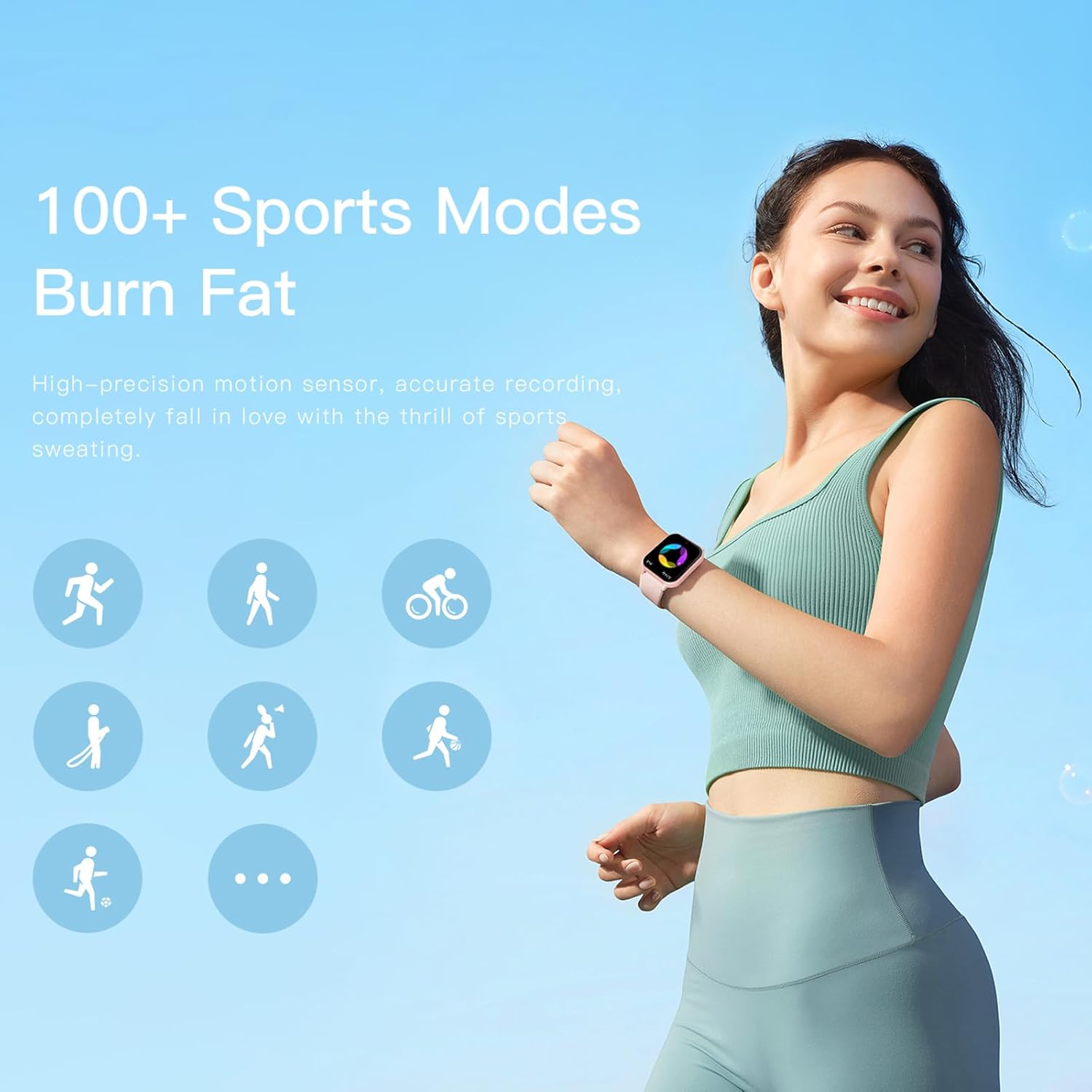 Sport Smart Watch: Equip with 100+ sport modes, collecting the steps, calorie consumption, exercise time, heart rate and so on. This allows you know when you should save motivation or keeping exercise hard, also let you know the real-time sport performance.