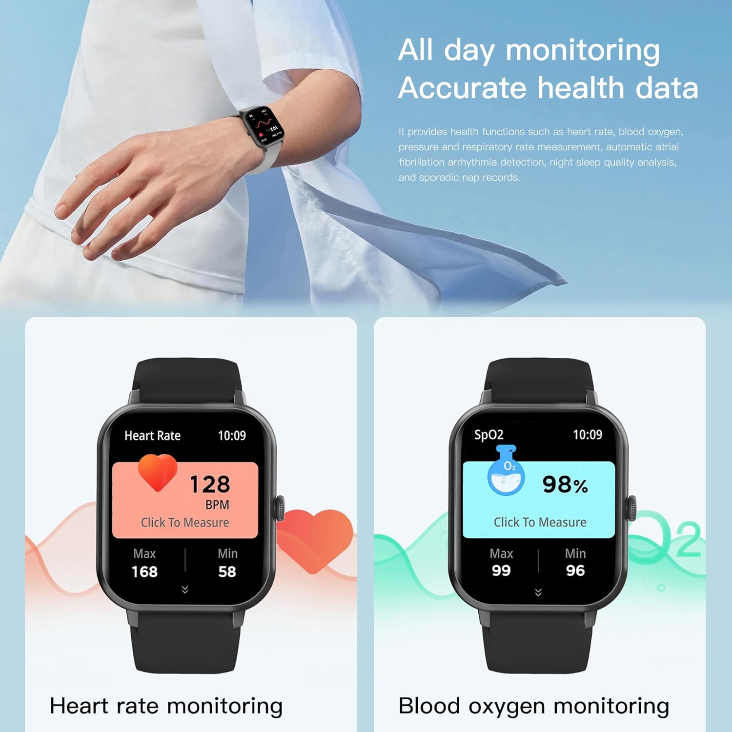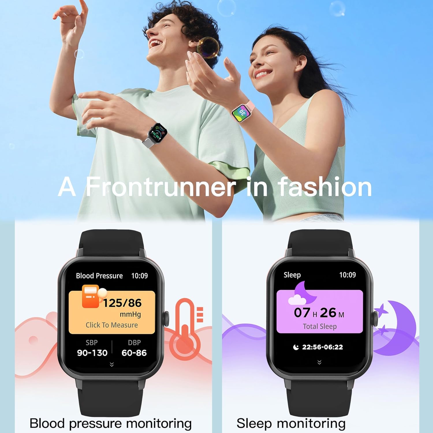 Health Watch: The smart watch supports 24-hour continuous heart rate, also monitor your real-time blood pressure and blood oxygen at any time with one click on the smartwatch.An automatic sleep tracker can monitor your sleep status and provide a comprehensive sleep quality analysis (deep sleep, light sleep, and wake-up time), allowing you to develop good sleeping habits.